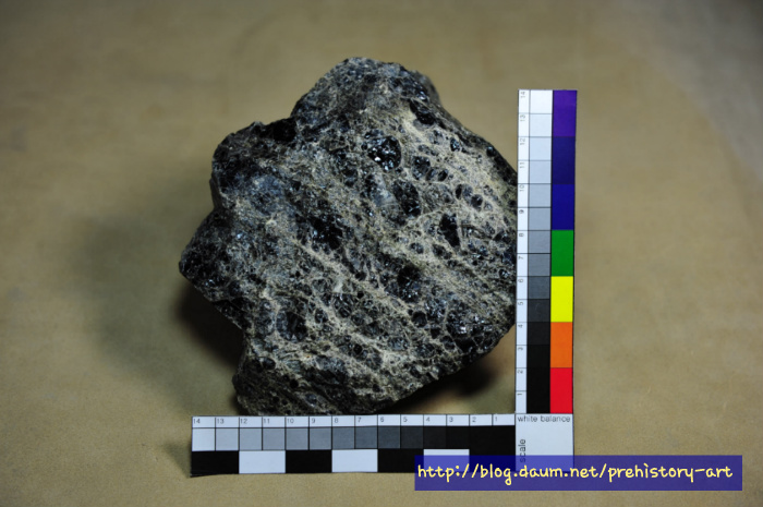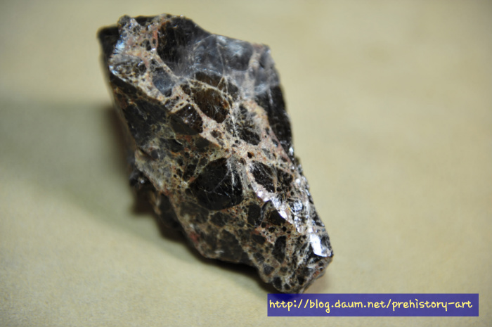 괴탄 또는 흑운모 결정 덩어리 처럼 보이나 세부적으로 살펴보면 온전한 천연유리구조라고 할 수 있다.
