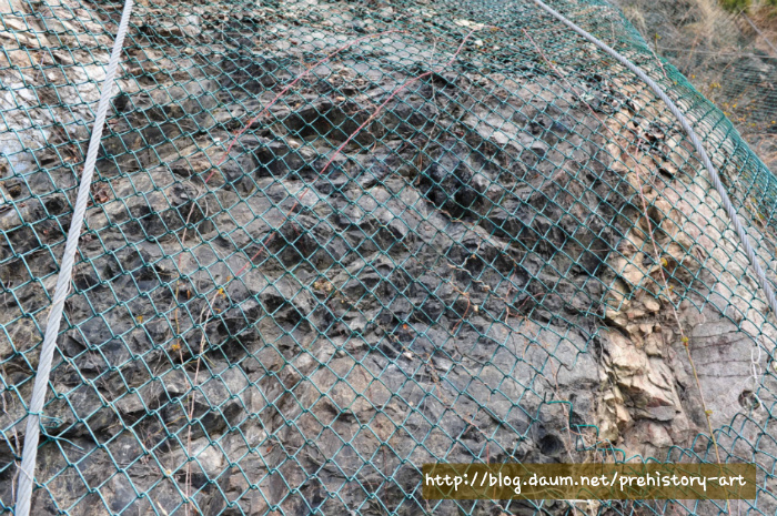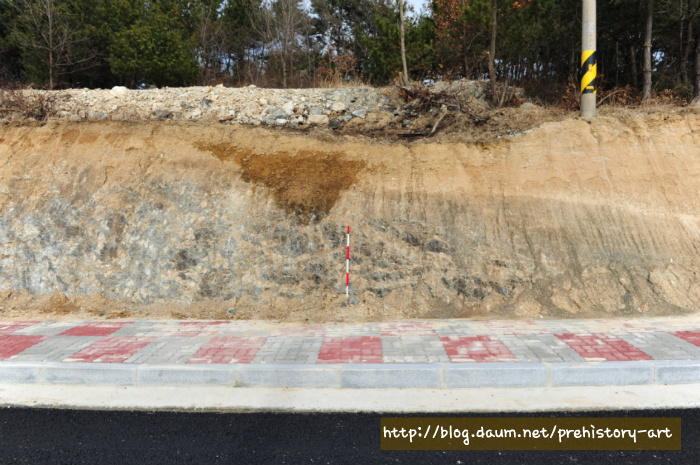 절개진 단면에서 검은부분이 전부 유리질화산암(송지암)이다. 그 이외의 부분은 라필리응회암, 유문암이다.