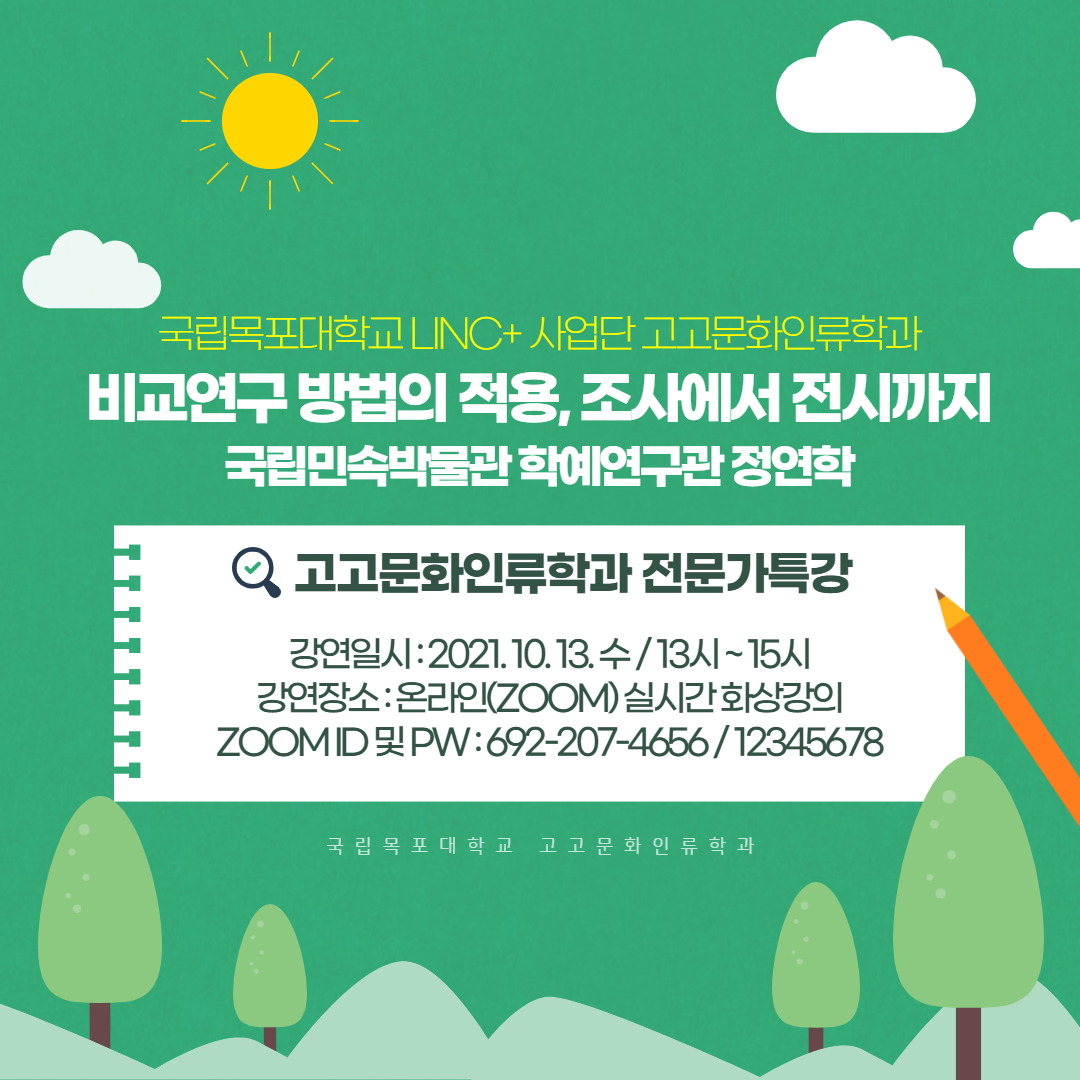 목포대학교 고고문화인류학과 특강 "비교연구 방법의 정욕, 조사에서 전시까지"라는 주제로 국립민속박물관 학예연구관이신 정연학 선생님을 모시고 특강이 이루어집니다. 많은 참여바랍니다.