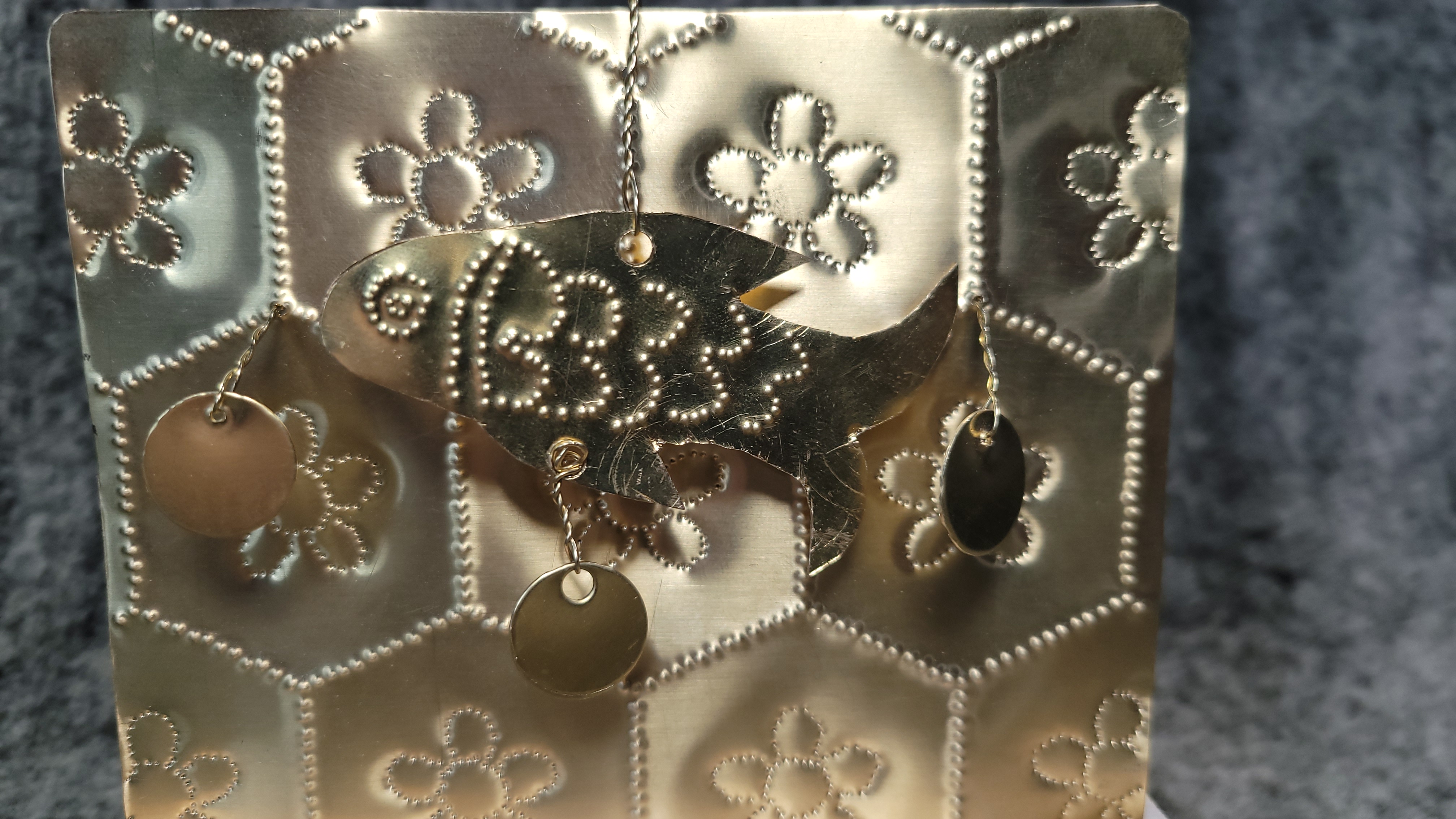 잉어로 추정되는 이 물고기 장식품은 금속판에 뾰족한 도구와 망치를 이용하여 한점 한점 때려가며 문양을 찍어 제작하였습니다. 문양이 섬세하여 삼국시대 금속세공기술을 체험해 볼 수 있습니다.
