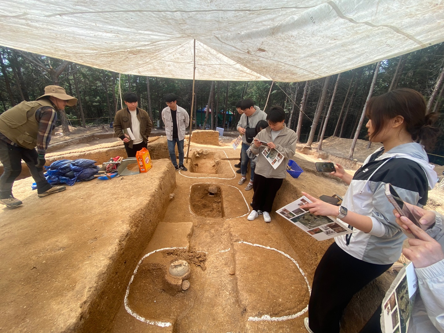 잘 정돈된 현장에 감탄하며, 열심히 조사성과를 들었습니다. 마침 오늘 확인된 토기는 여러가지로 흥미롭네요. 4세기대 목관묘와 관련유물을 보며 해남반도의 새로운 이야기가 쓰여질 수 있을 것 같아 기대됩니다. 오랫만에 야외 활동에 즐거워 하는 1학년 학생들에게는 방산리 장고봉의 웅장함은 오래 기억될 같습니다.