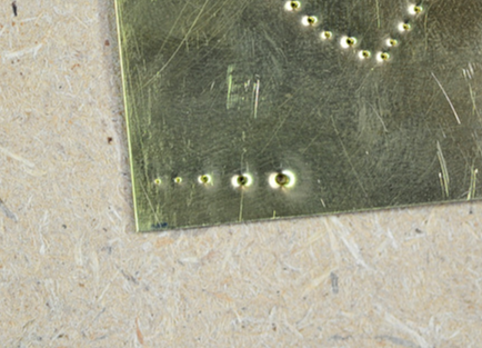 망치를 내려치는 힘에 따라 금속판에 찍히는 점의 크기가 모두 다릅니다. 왼쪽의 가장 작은 점이 가장 적은 힘으로 때린 것이며 많은 힘으로 망치를 때릴수록 점차 점 모양이 커지는 모습을 확인 할 수 있습니다.