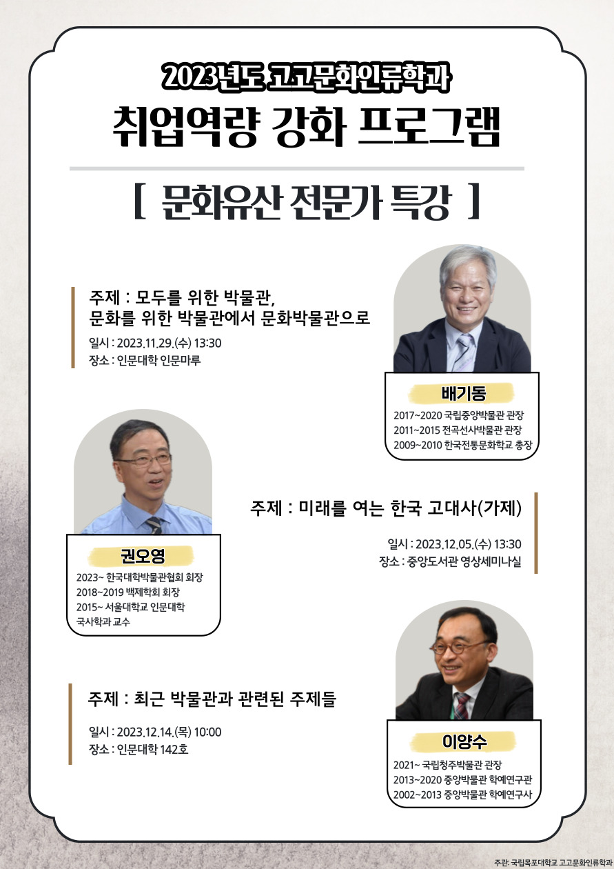 | 2023년도 2학기 목포대학교 고고문화인류학과 취업역량 강화 프로그램 특강(배기동 교수님) (0) | 2023.11.30 |