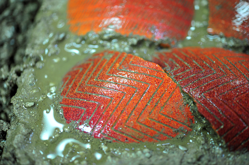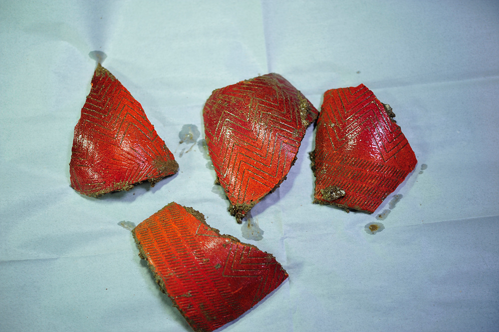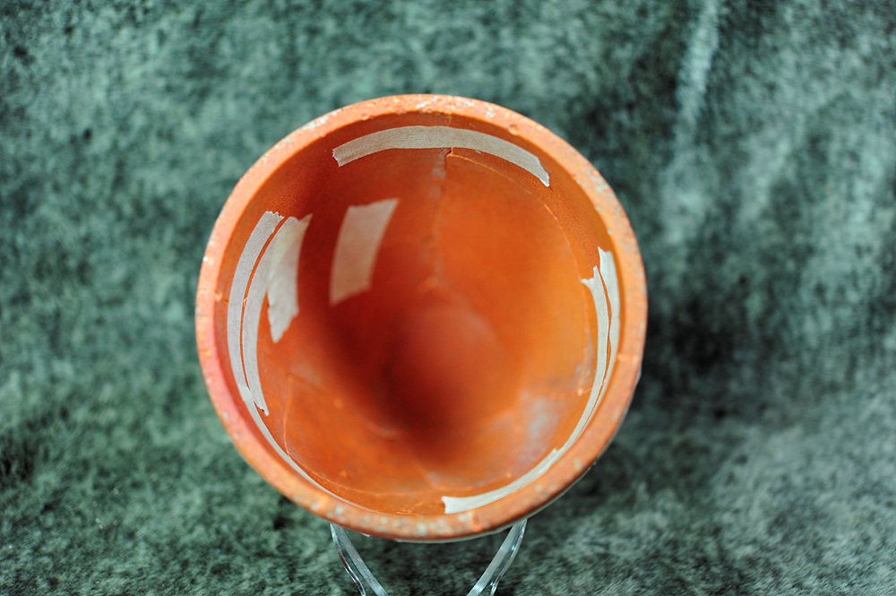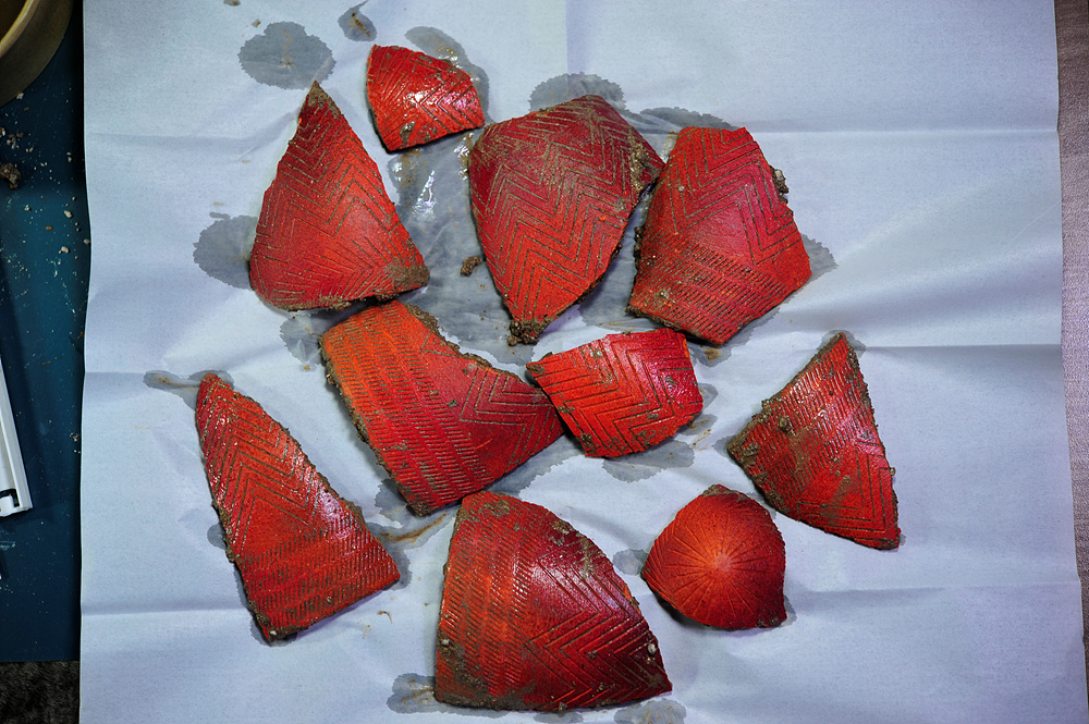 토기 문양에 박혀 있는 흙들은 무리하게 제거할 필요가 없습니다. 토기 문양과 표면에 손상을 입을 수 있습니다.