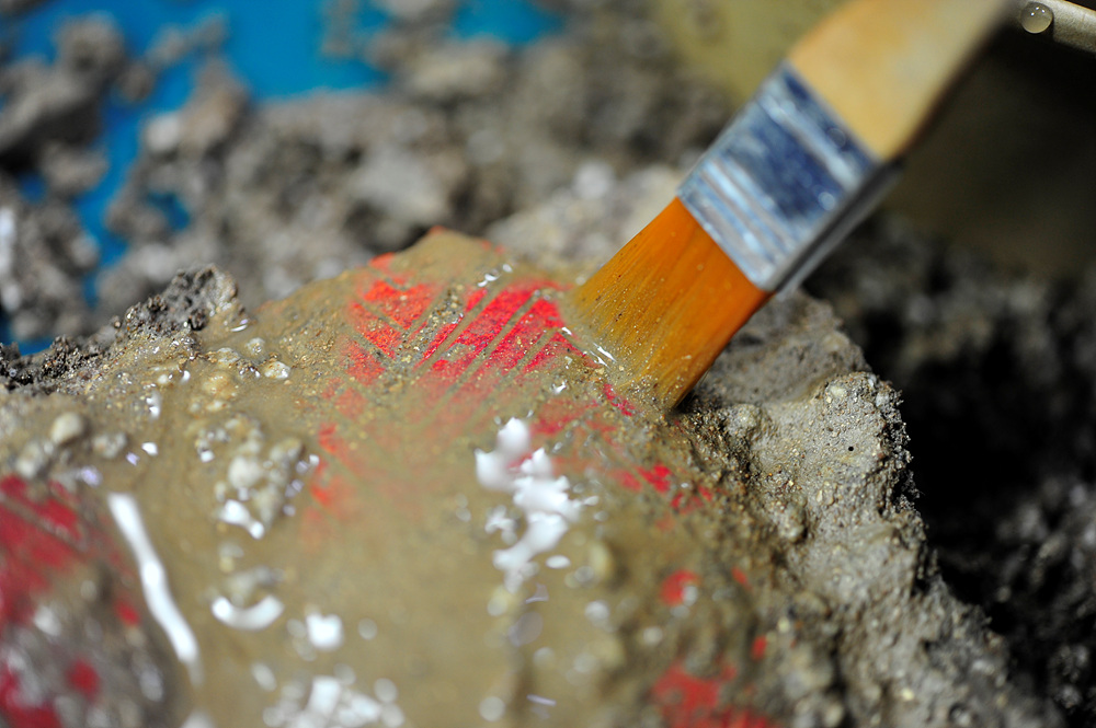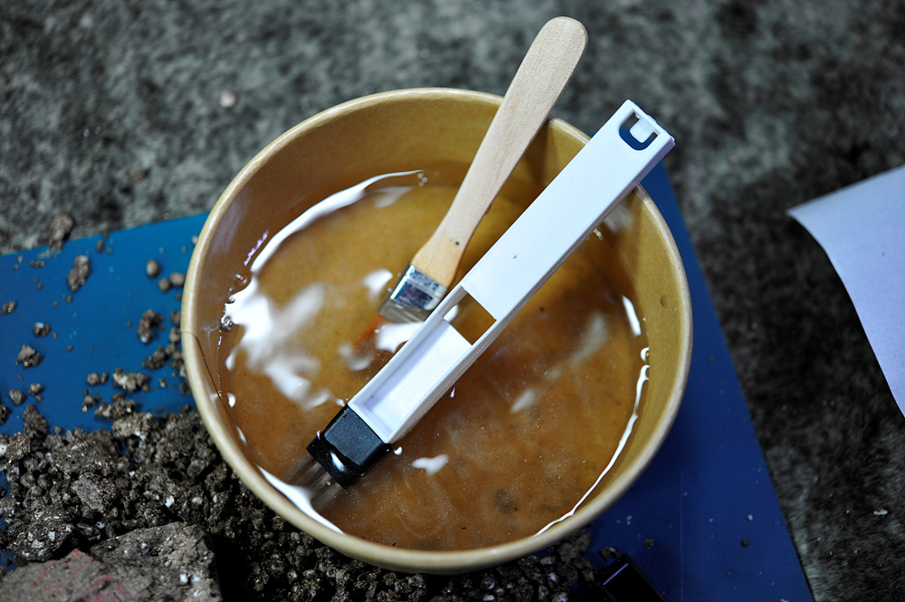 동봉된 스프레이와 붓을 이용하여 토기조각 표면을 1차적으로 세척해 줍니다.