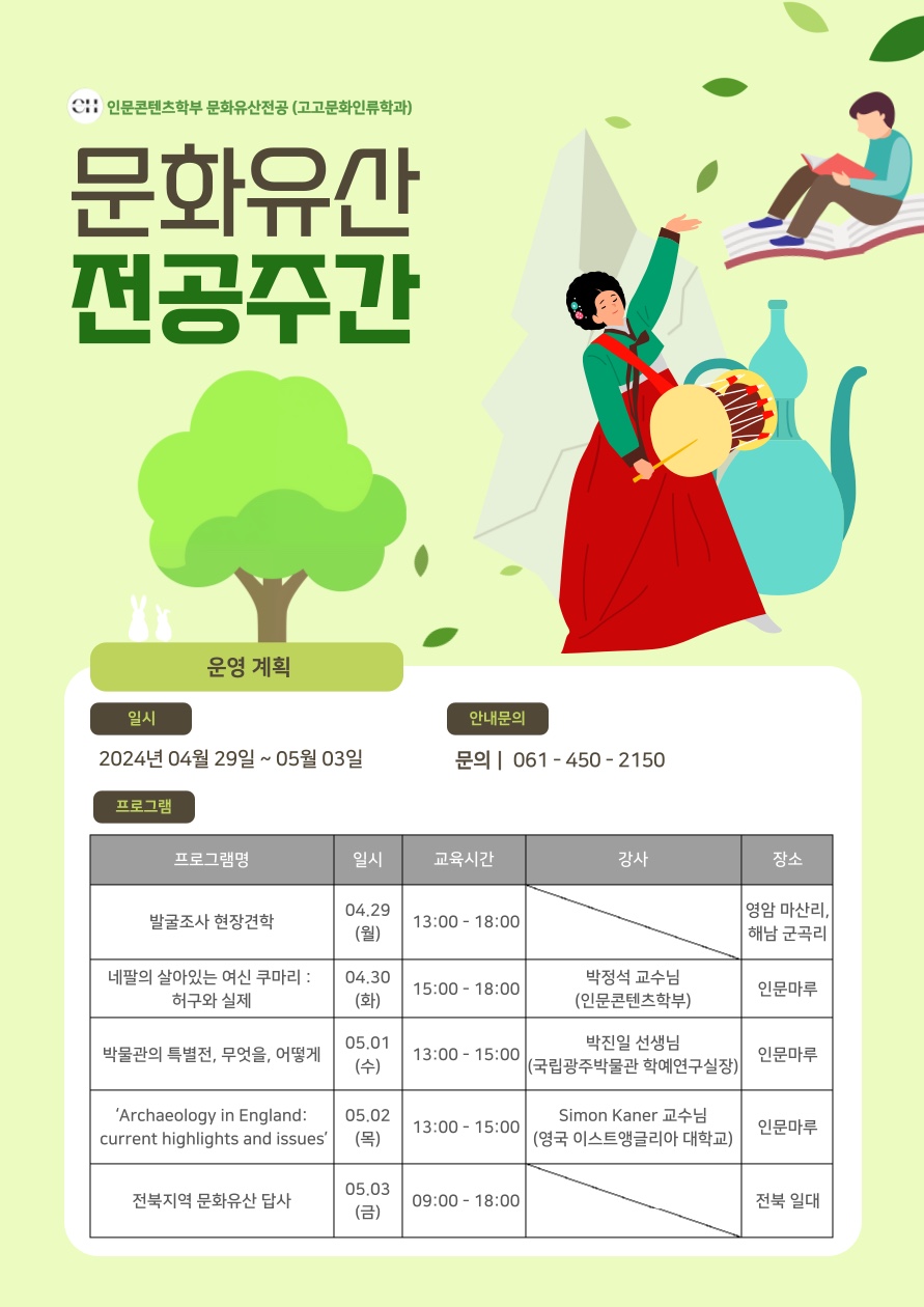 | 2024년도 1학기 목포대학교 인문콘텐츠학부 문화유산전공 전공주간 프로그램 (0) | 2024.05.05 |