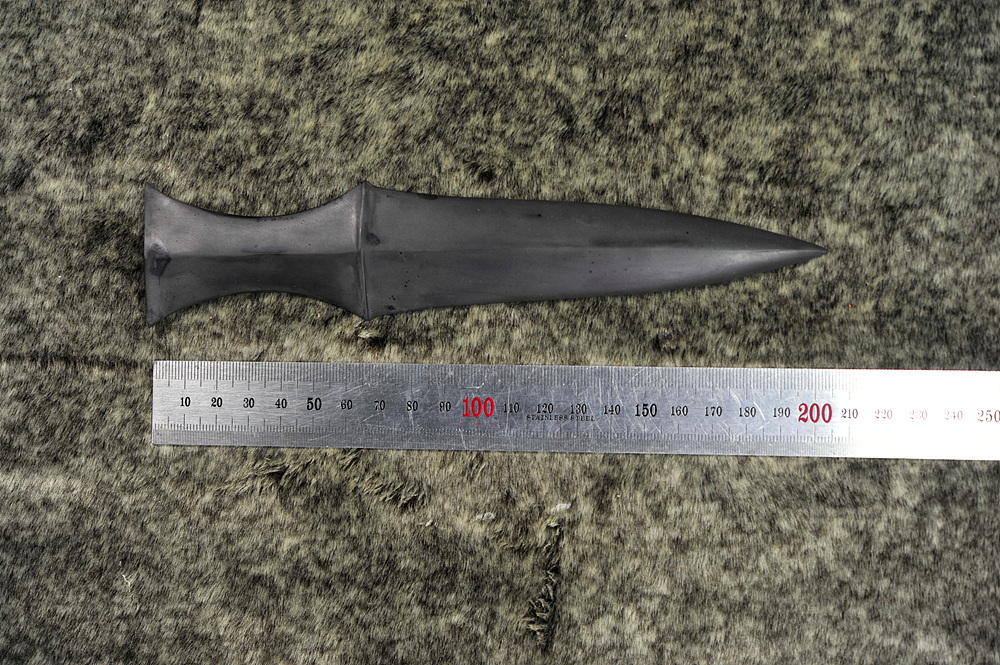 석검의 총길이는 약 20cm 내외(손 한뼘 정도)로 소형이며 실제 청동기시대 마제석검의 제작방식과 동일하게 수제작으로 직접 마연하여 제작된 석검입니다.