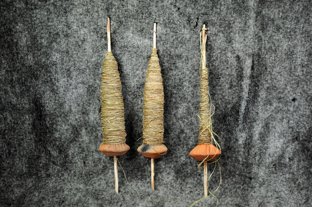 천연끈을 가락바퀴를 이용하여 실제로 꼬아서 제작한 후 전시연출
