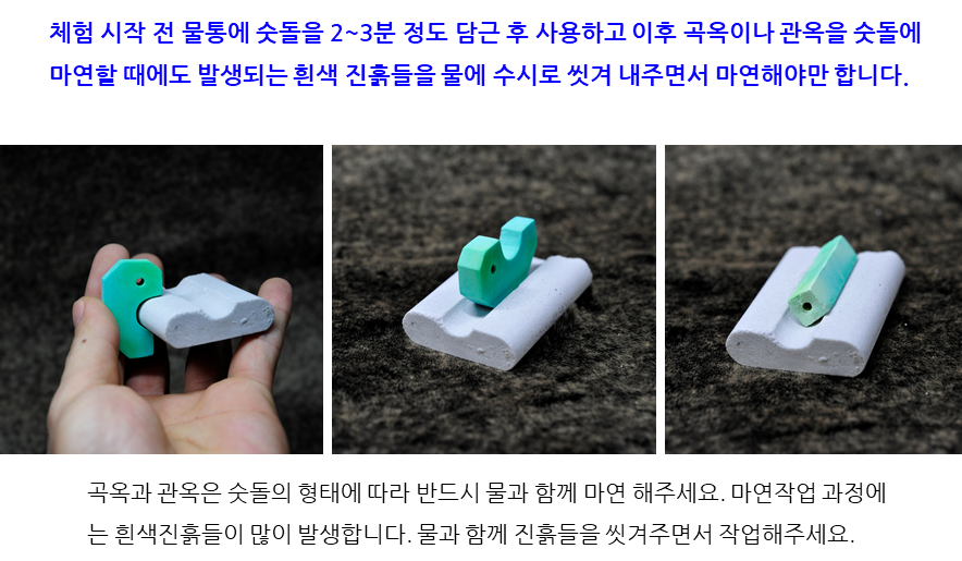 옥( jade)을 가공하기 위해서는 매우 힘든 마연과정과 광택과정을 필요로 하며 매우 단단한 암석입니다. 옥을 생산, 가공하는 전문가들 조차 옥을 다루는 일은 매우 고된 작업으로 기계가공을 하지 않는 수작업과정에는 하루에 곡옥 한점 완성시키기에도 어렵습니다. 옥은 마연작업을 하면 매우 높은 열을 발산하는 특성을 가지고 있습니다. 수작업 가공시에는 뜨거워져 만지기도 어려울 정도가 되기 때문에 반드시 물을 공급하여 열을 식혀줌과 동시에 발생하는 흰색 머드(옥가루)를 씻겨주면서 작업해야 합니다.