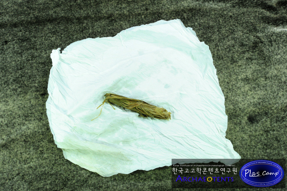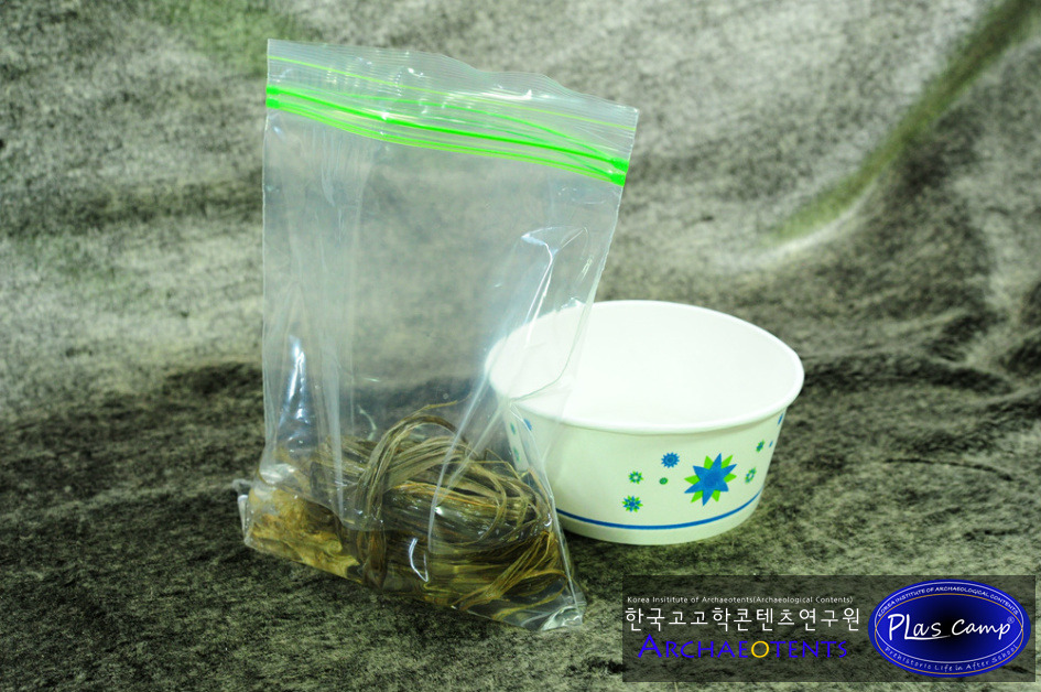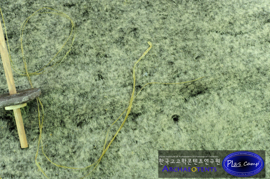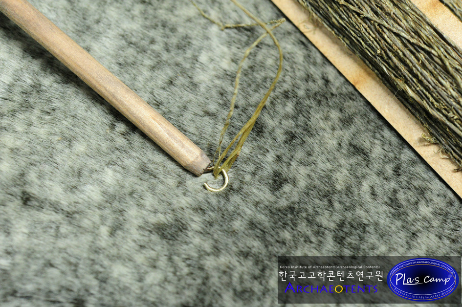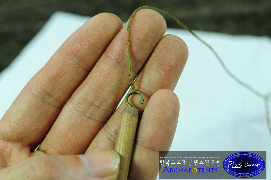 가락바퀴에 감긴 끈을 실감개로 옮길 때 밀납칠을 하여 실의 강도를 높일 수 있습니다. 한꺼번에 가락바퀴에서 많은 실을 풀어 밀납작업을 하면 실이 다시 꼬이게 되니 주의바랍니다.