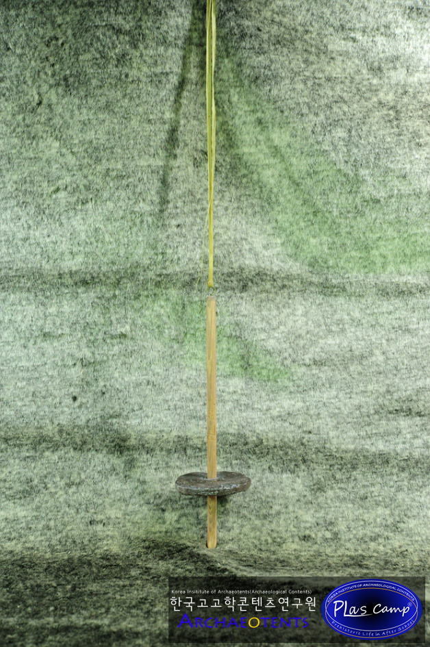 이 고리구멍은 가락바퀴 하단의 나무 축에 걸어줍니다. 이제 본격적인 실잣기가 준비된 상태입니다.
