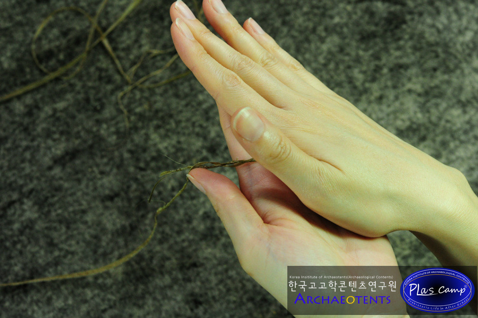 가락바퀴 체험의 가장 어려운 부분으로 꼬아진 실에 새로운 삼줄기를 연결하는 과정입니다.
