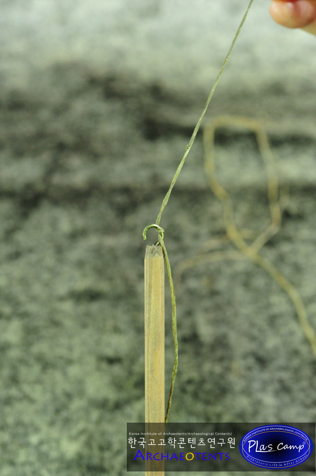 원줄을 반으로 접어 가락바퀴 상단 고리에 걸어놓습니다. 가락바퀴 고리에 걸어놓은 삼줄기의 반대편 끝부분입니다.