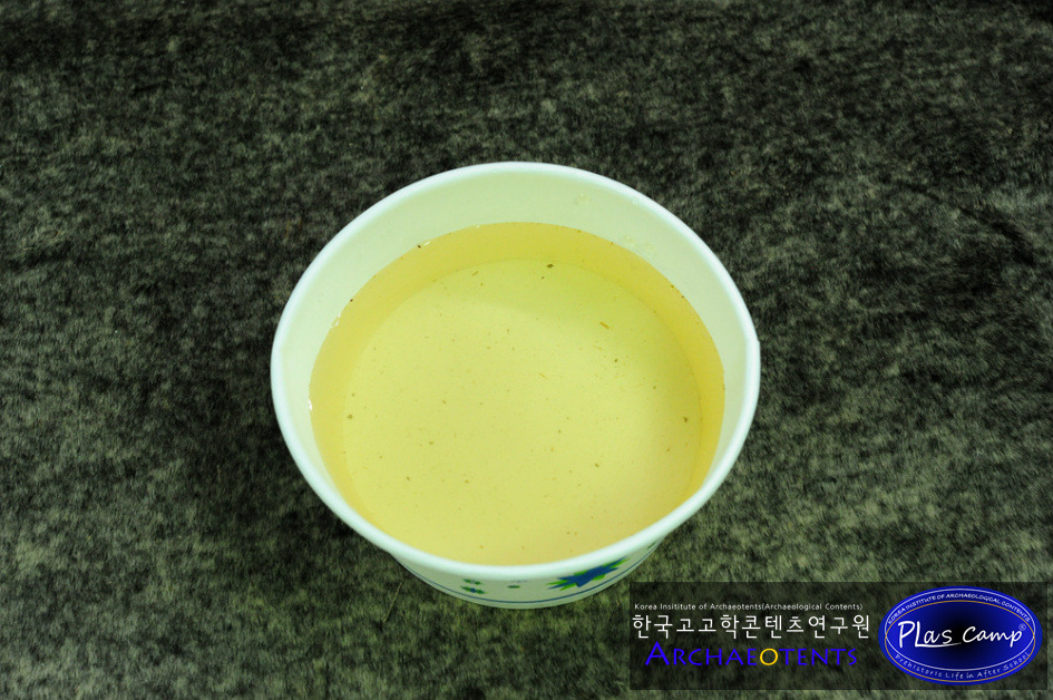 지퍼백에 담긴 체로 삼줄기를 쥐어 짜내면서 최대한 물기를 빼냅니다. 삼줄기에서 우러나온 물입니다. 물은 한곳으로 모아 버릴 수 있도록 합니다.