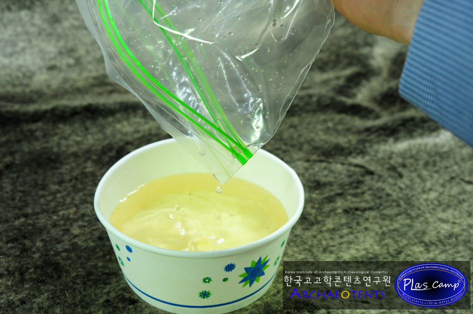 삼줄기가 있는 지퍼백을 열어 종이그릇의 물을 안에 부어 넣습니다.