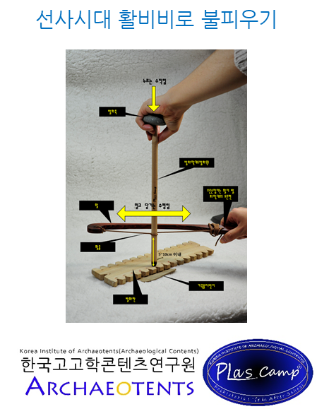 8. 불피우기의 가장 중요한 기술은 활질을 수평으로 밀고 당기는 것과 다른 한손으로 발화축을 지긋이 누르는 힘(마찰력)의 조화입니다.(발화축을 누르는 힘이 강하면 마찰력은 커지지만 활질이 쉽지 않습니다. 반대로 누르는 힘이 약하면 마찰력은 약하지만 활질을 하기 쉽습니다. 활질을 수평으로 반복적으로 움직일때 발화목이 수직으로 고정되지 않고 흔들리면 쉽게 발화판에 마찰열이 모이지 않습니다. 많은 연습이 요구됩니다.)