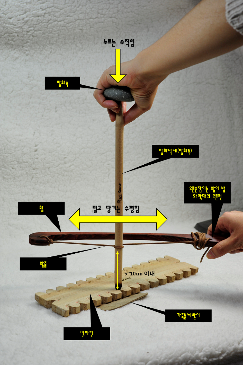 4. 발화목에 감긴 활줄은 반드시 밑에서 부터 5~10cm 이내의 위치하고 있어야 합니다.(그이상 부분에 활줄이 감겨있을 경우 활질을 할때 중심을 잡기 어렵습니다.)