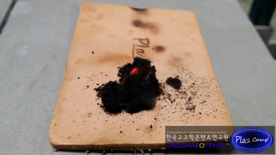9. 활질을 하는 동안 발화판과 발화막대가 서로 마찰하면서 연기가 나면서 목탄부스러기가 발화판에 잘 모이고 있는지 확인해야 합니다. 이러한 목탄부스러기들이 손톱크기 정도 모였을때 활질을 멈추고 불씨를 살펴보시길 바랍니다. 불씨를 살펴보는 가장 빠른 방법은 활질을 멈춘후 목탄부스러기에서 계속 연기가 나고 있다면 불씨가 옮겨 붙은 것입니다.
