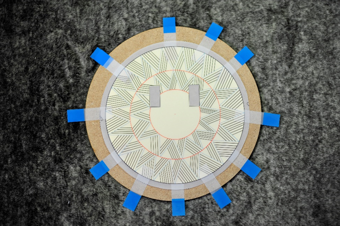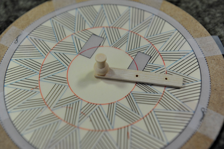 콤파스에 있는 나무핀을 정확히 도안 중심의 빨강점에 찔러 고정시켜 줍니다. 손힘이 약할 경우 도움을 받아 나무망치를 살짝 두드려가면서 고정합니다.