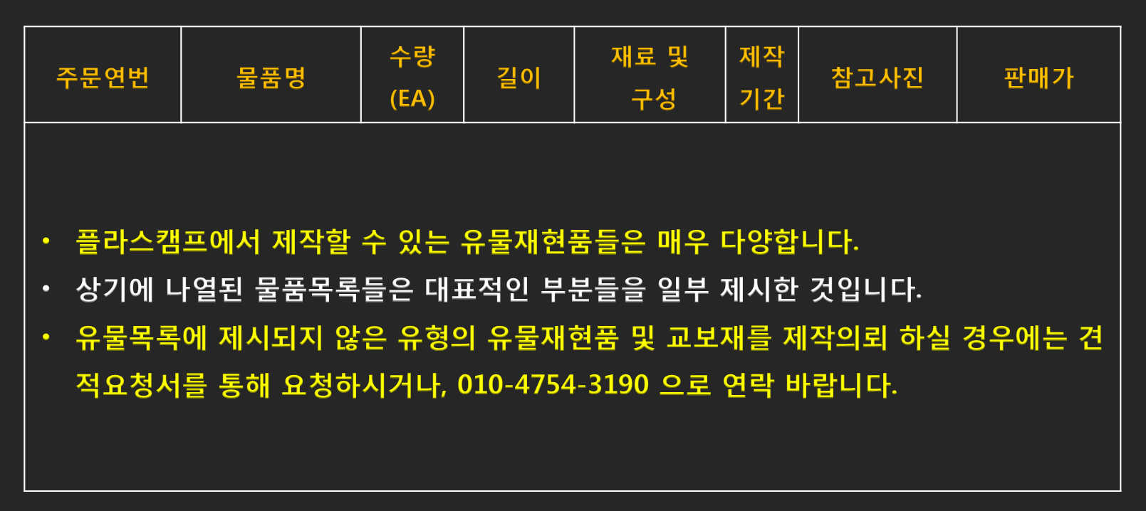- 유물재현품의 경우 제작 판매되고 있는 복원품 일부를 리스트에 나열한 것이며 유물재현대상에 대한 구체적인 내용(출토유적, 유물재질, 유물크기 등)을 의뢰하시면 견적가를 제시해드립니다.