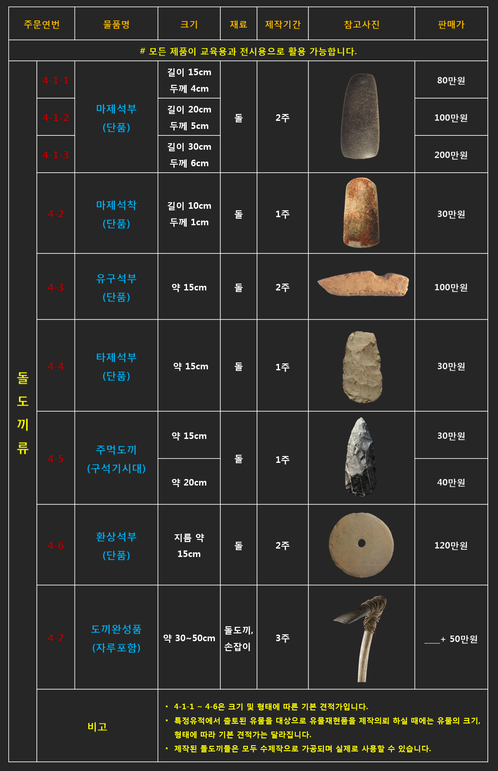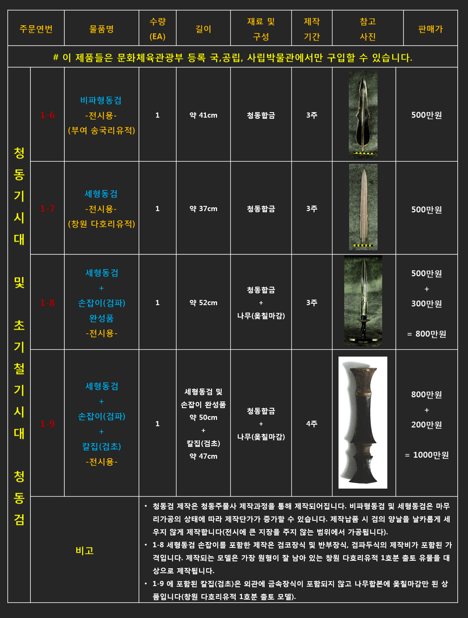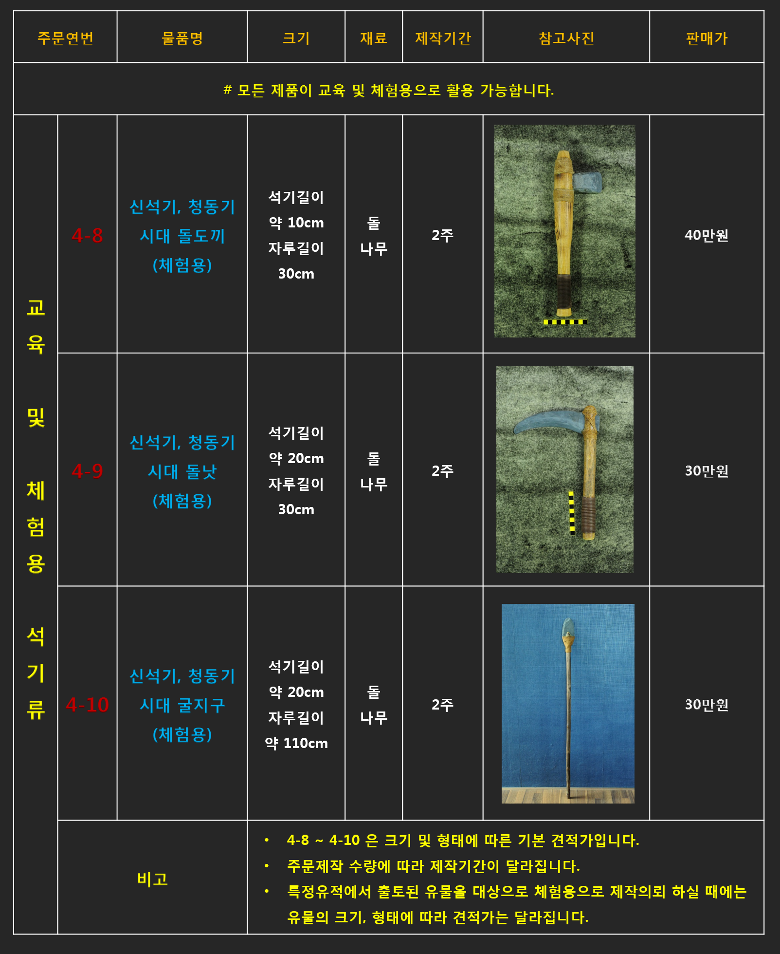 - 리스트에 있는 품목 중 유물재현품이 아닌(박물관 전시용) 단순체험용 및 교구로 사용하시길 원하신다면 제품의 품질(크기 및 재질, 완성도 등)을 조절하여 가격조정이 가능 합니다.