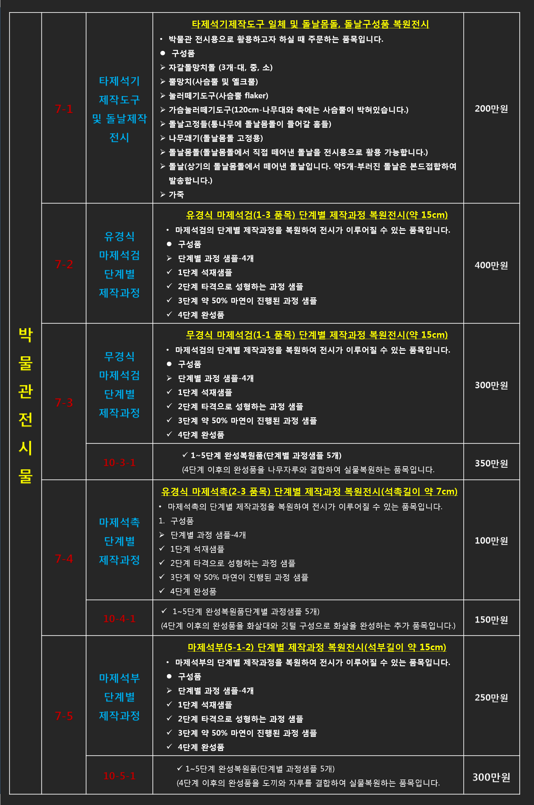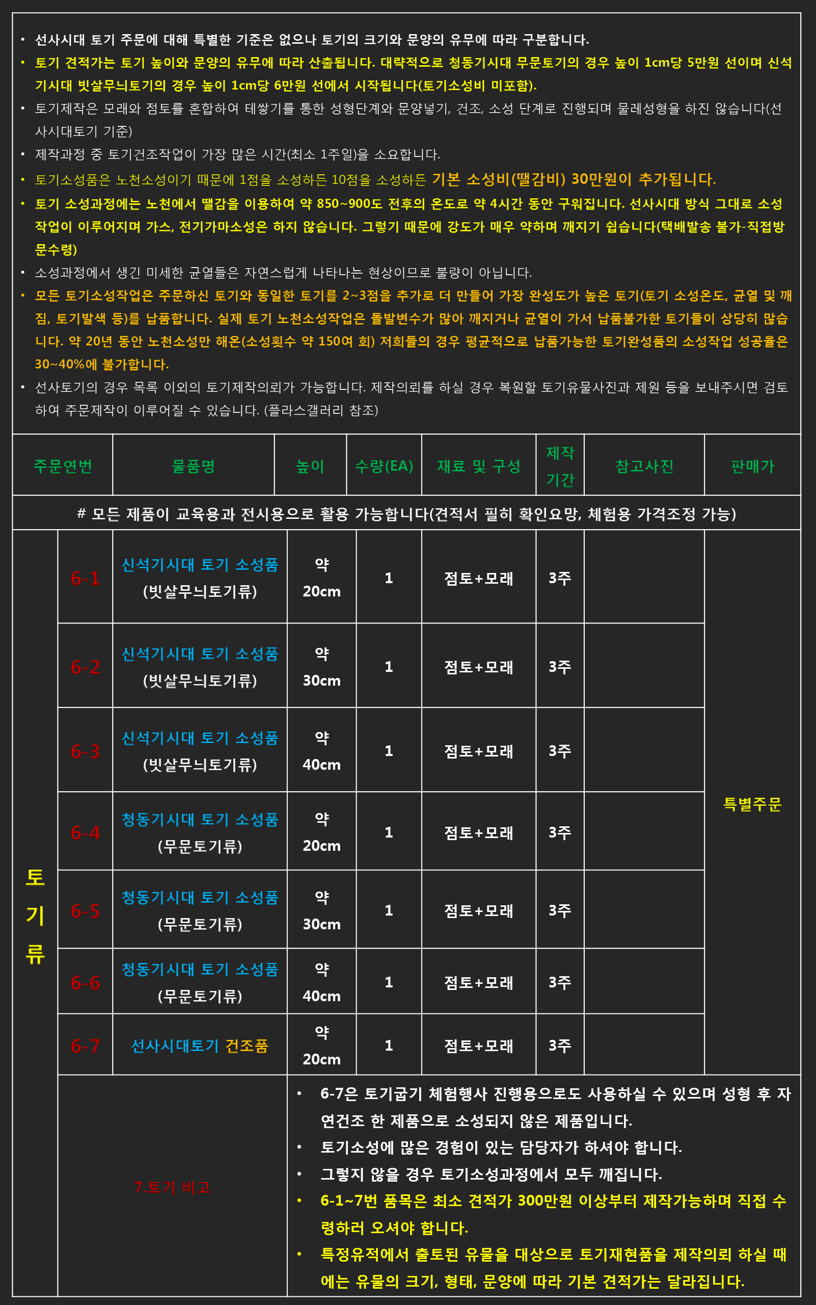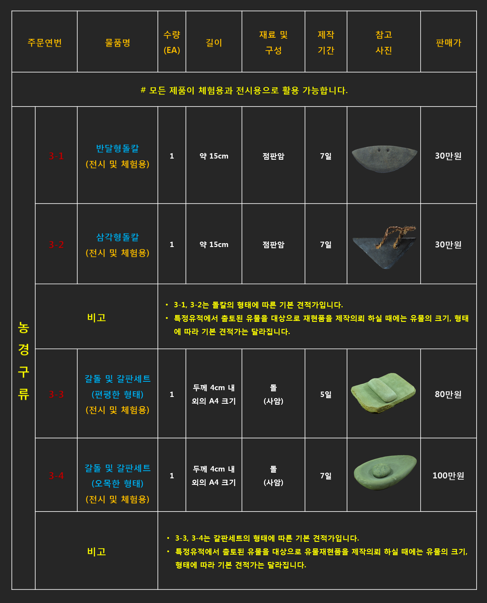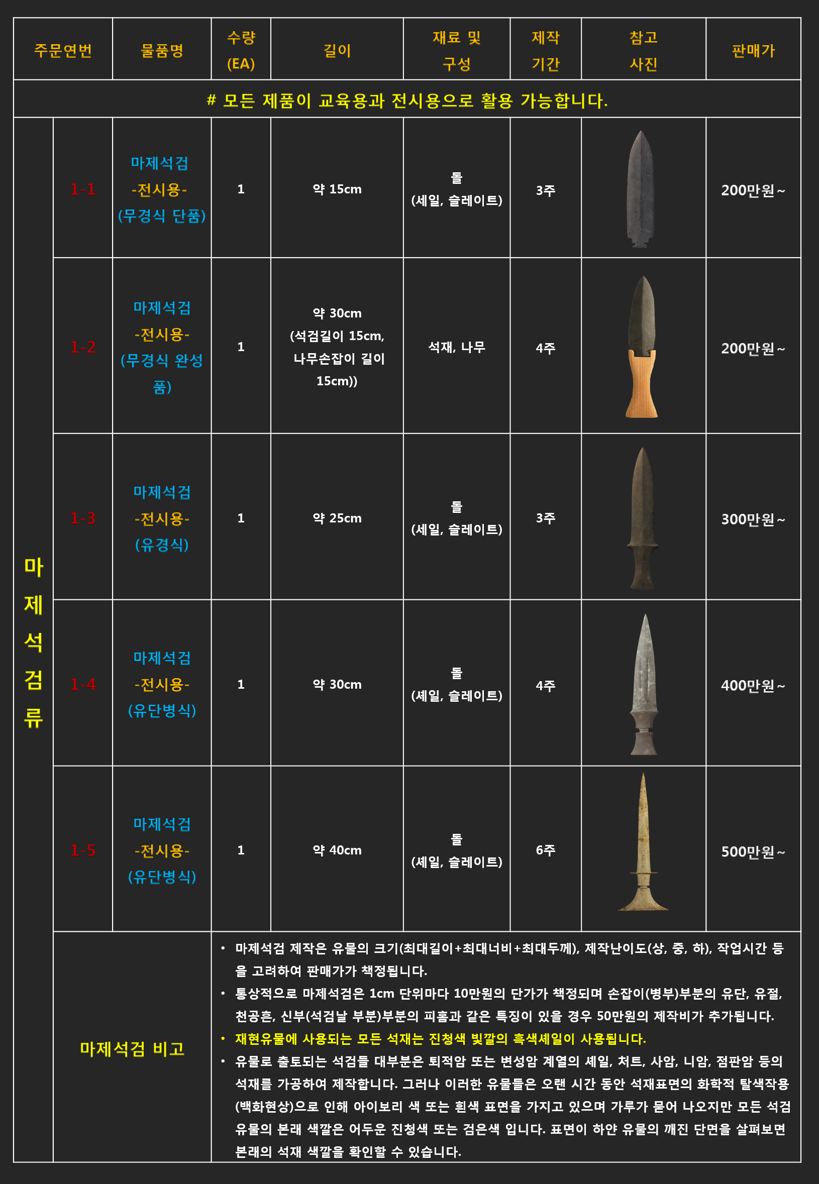 - 리스트에 있는 품목 중 유물재현품이 아닌(박물관 전시용) 단순체험용 및 교구로 사용하시길 원하신다면 제품의 품질(크기 및 재질, 완성도 등)을 조절하여 가격조정이 가능 합니다.