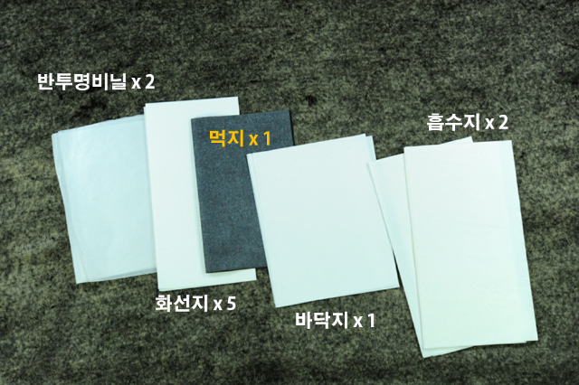 (화선지, 바닥지, 화장지, 탁본솔, 분무기, 먹방망이, 먹물통,먹물접시)