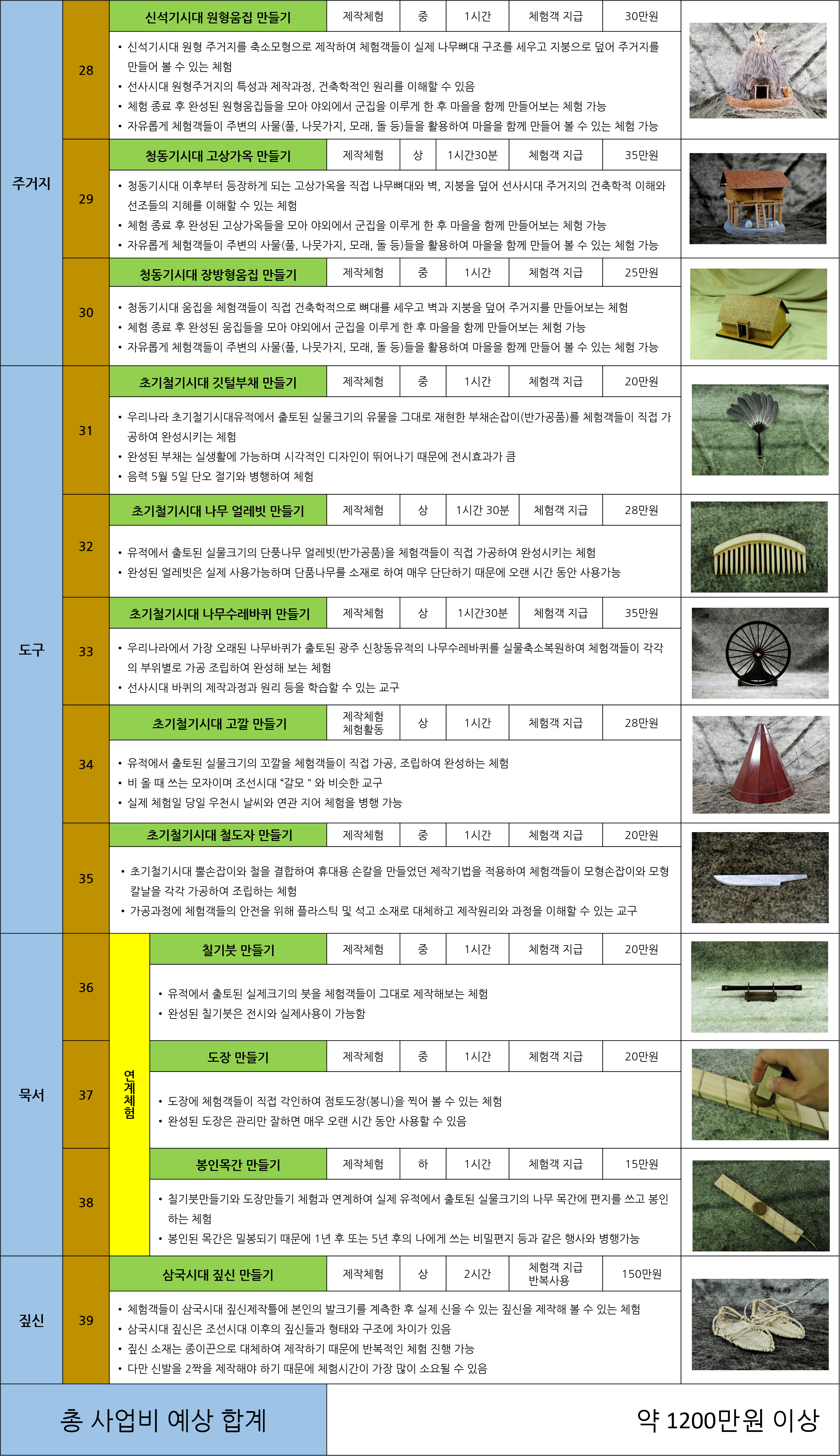 - 각각의 커리큘럼 내의 프로그램 및 예산 내역(교보재 구입비)은 체험객 10인이 약 40주 동안(1주 1개 프로그램) 각각의 프로그램을 시대순으로 테마별 학습이 가능하도록 작성되었습니다.