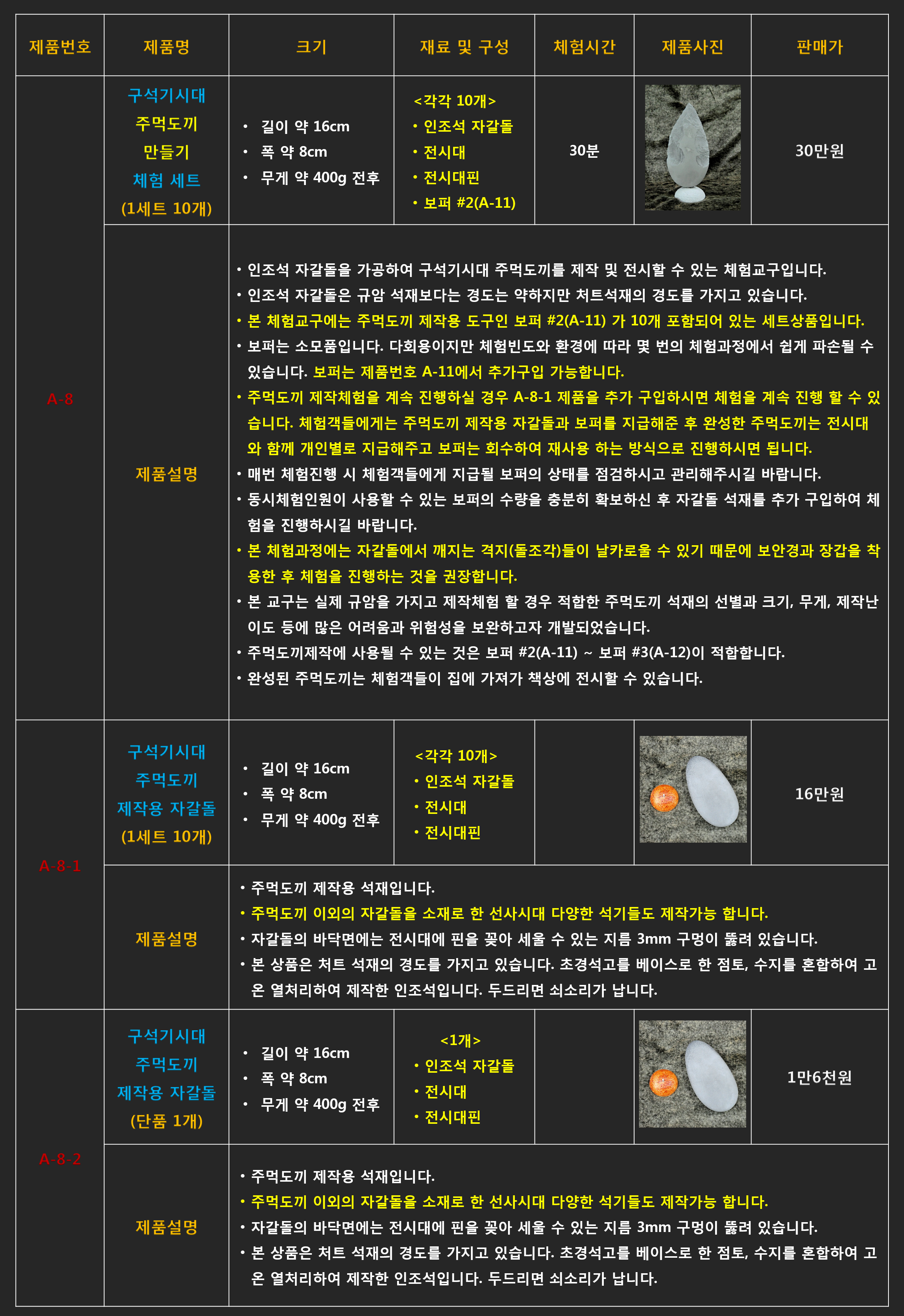 # A-8 구석기시대 주먹도끼 만들기 체험 세트 이 교구는 안전관리가 반드시 필요한 교구입니다. 체험객들에게 반드시 보호장갑과 보호안경을 착용시킨 후 체험이 진행되어야만 합니다. #A-8 구석
