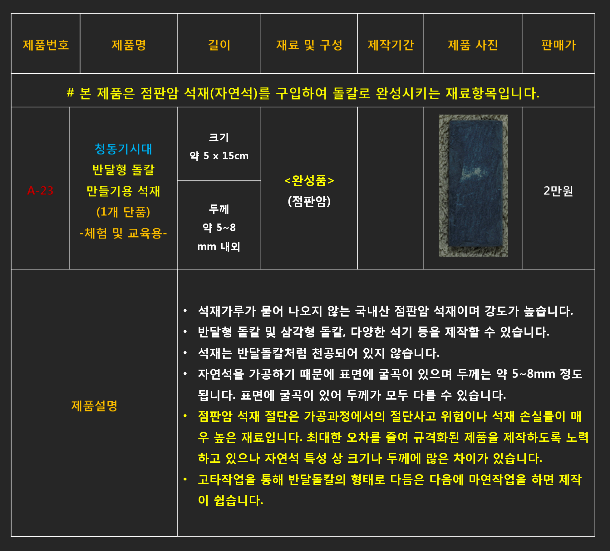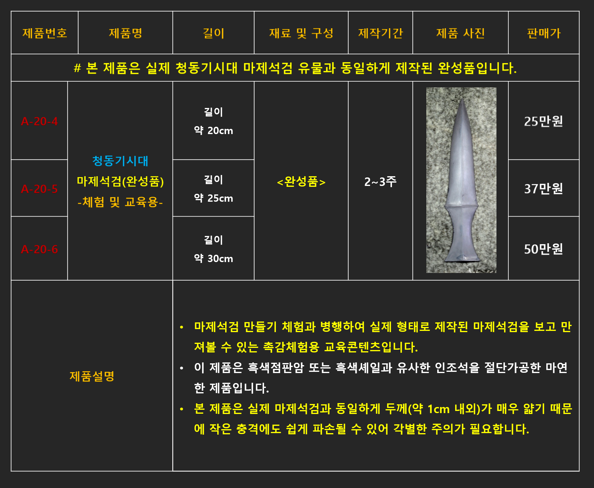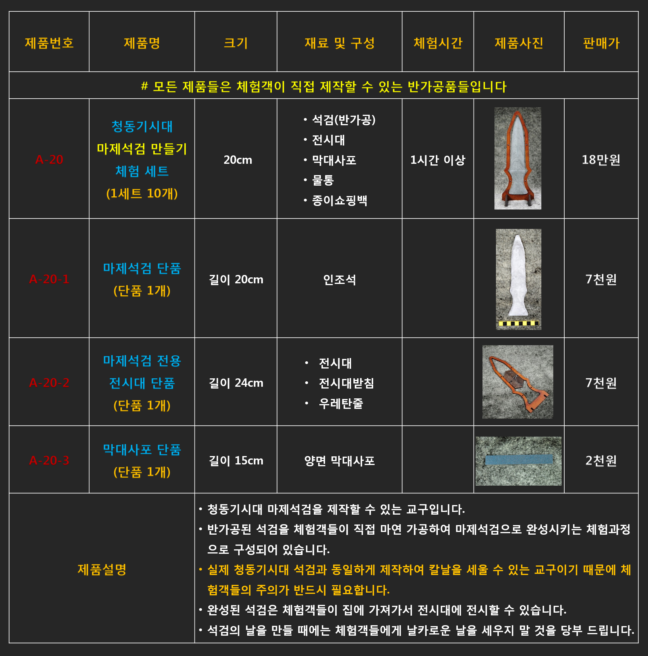 # A-20 청동기시대 마제석검 만들기 체험 세트 청동기시대 석검을 제작체험할 수 있는 교구입니다. 이 교구는 초등학교 5학년 이상부터 체험할 수 있으며 체험시간은 약 40분~50분 정도 소요됩니다