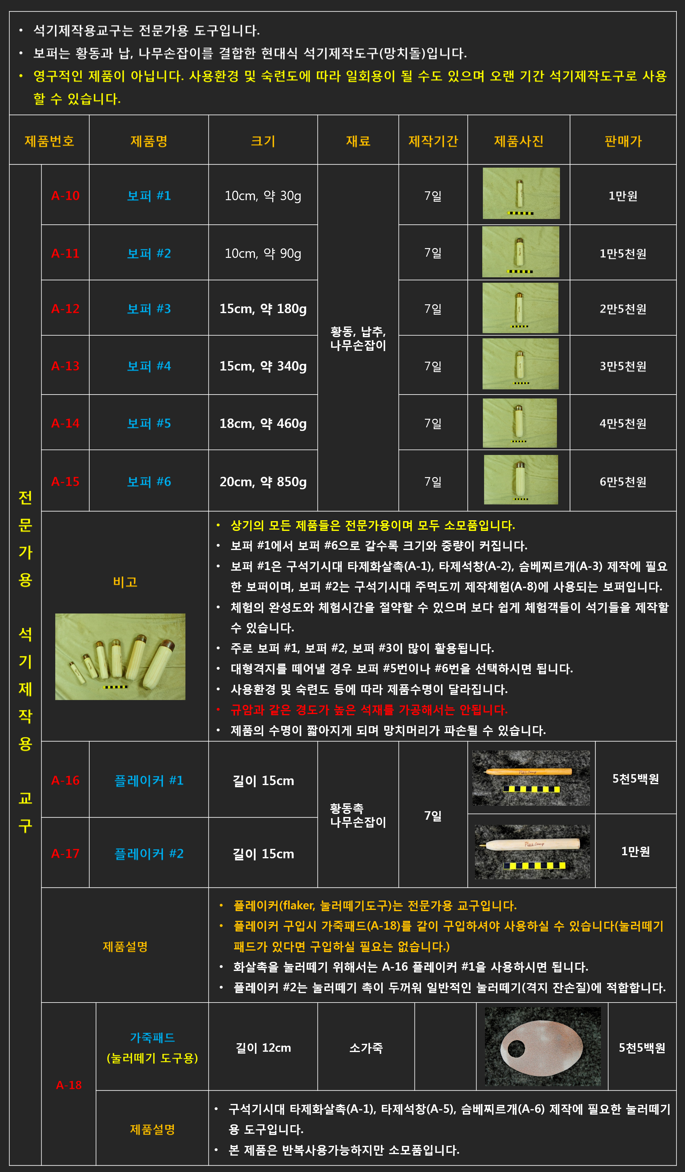 # A-10 ~ # A-18 전문가용 석기제작용 교구(보퍼 및 플레이커)