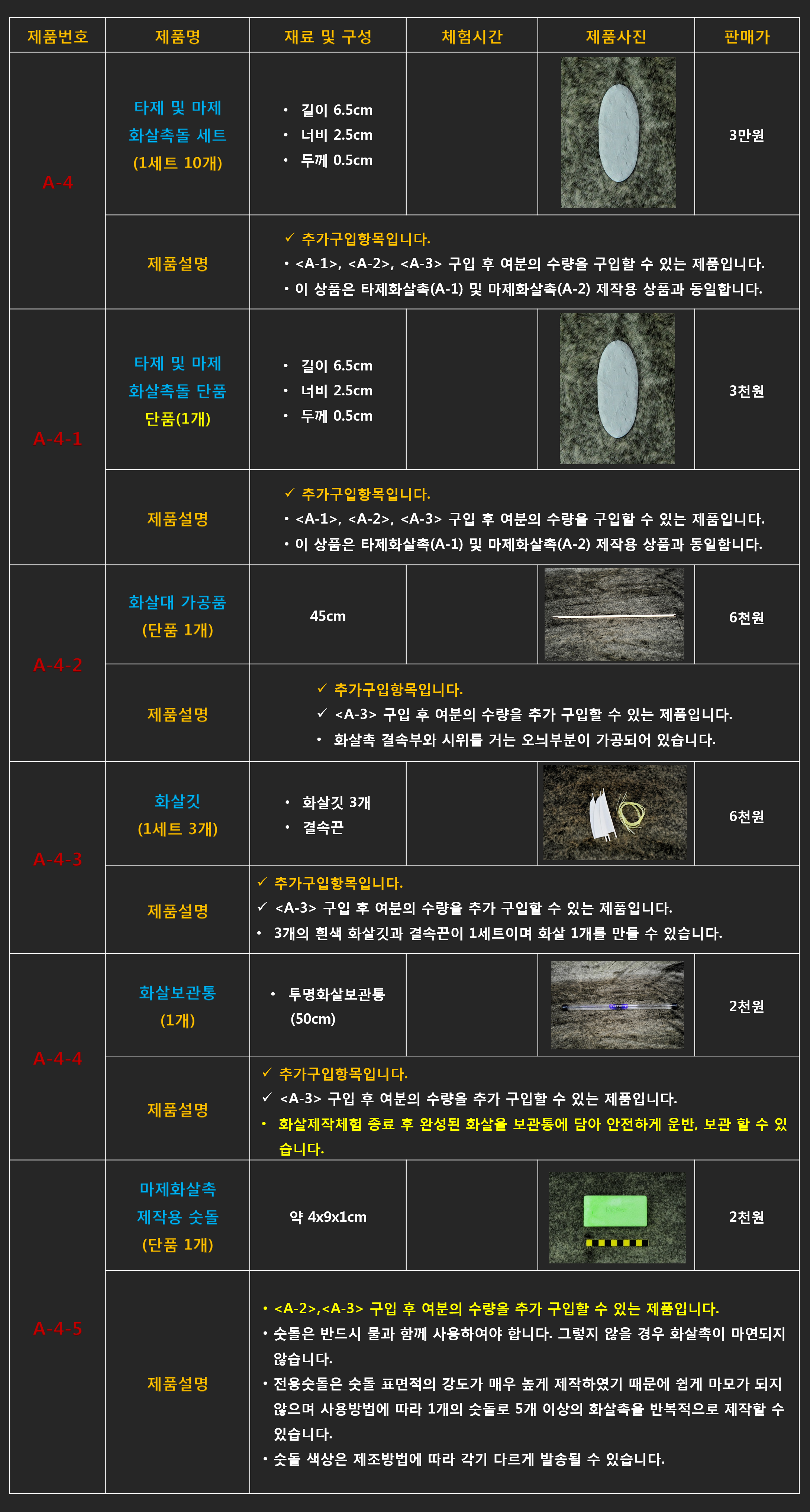 # A-2 마제화살촉 만들기 체험 세트 이 상품은 A-1(타제화살촉 만들기 체험 세트)과 동일하지만 눌러떼기 도구들이 제외되고 숫돌이 추가된 제품입니다. 제작난이도에 따라 구분하여 마제화살촉