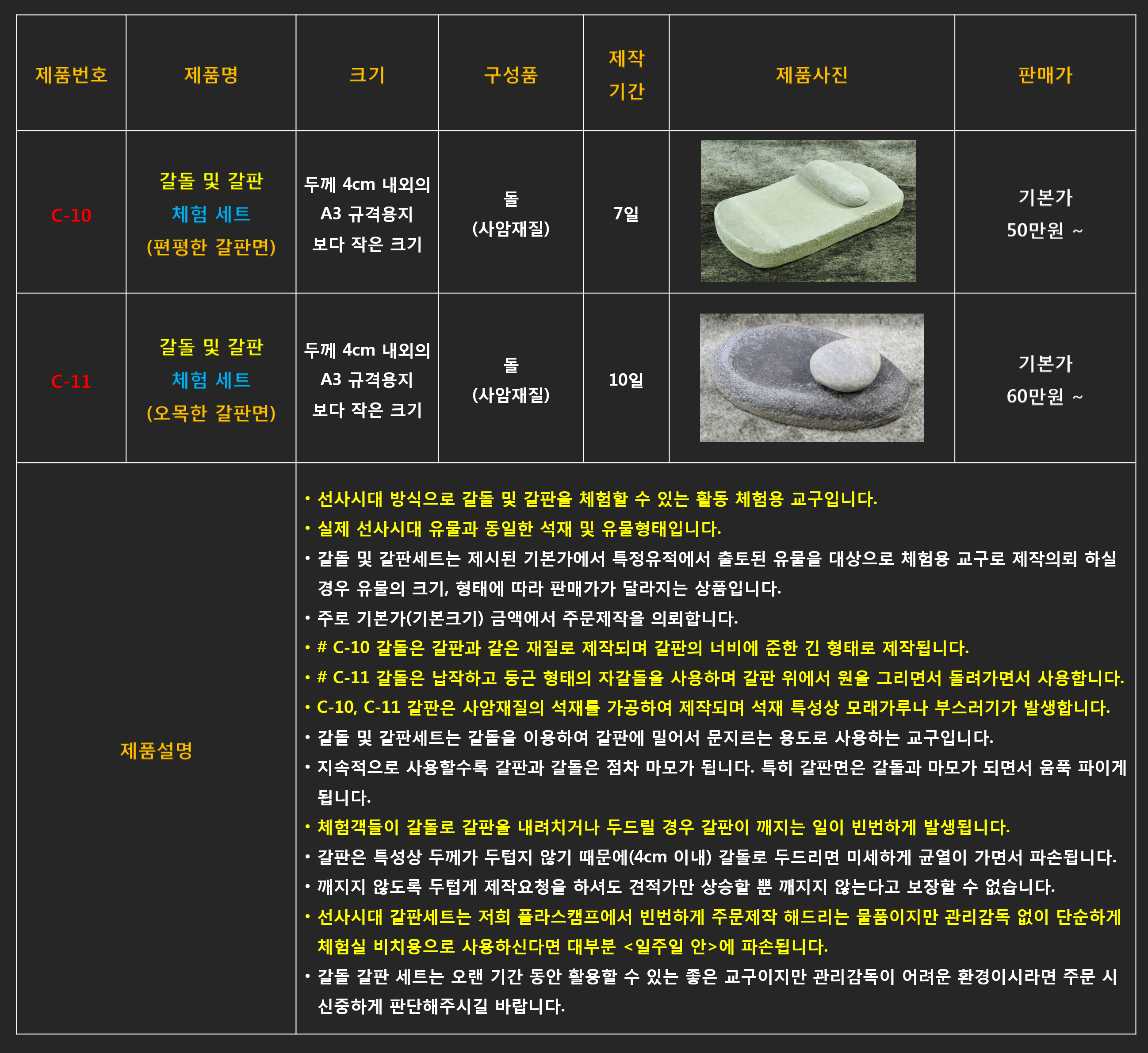# C-10, # C-11 갈돌 및 갈판세트(체험 및 전시유물 복원) 본 제품은 관리 및 지도가 없이 체험실 및 야외 체험장 비치용으로 구비하실 경우 쉽게 파손되는 제품으로 절대로 구입하시면 안됩니다. 체
