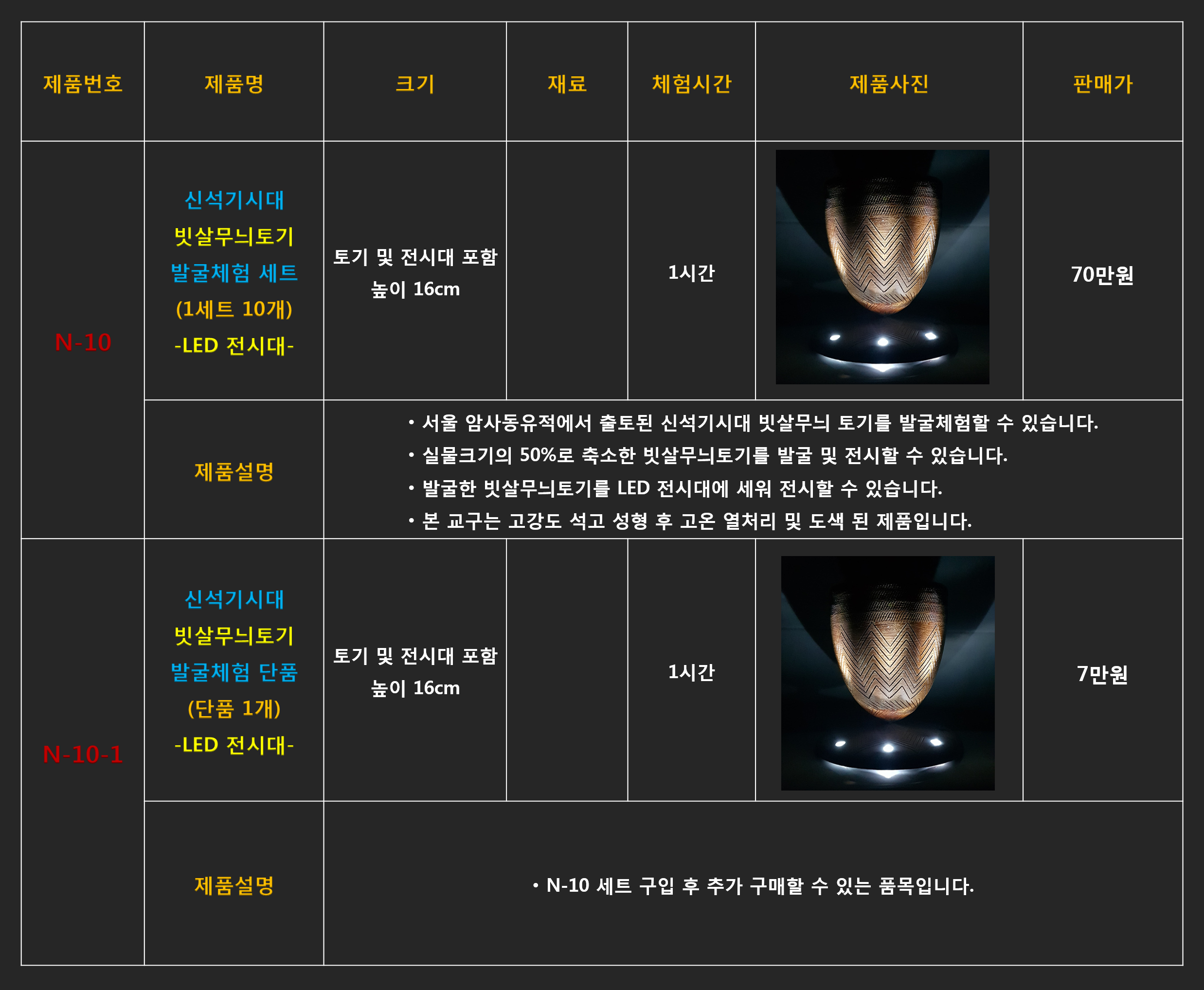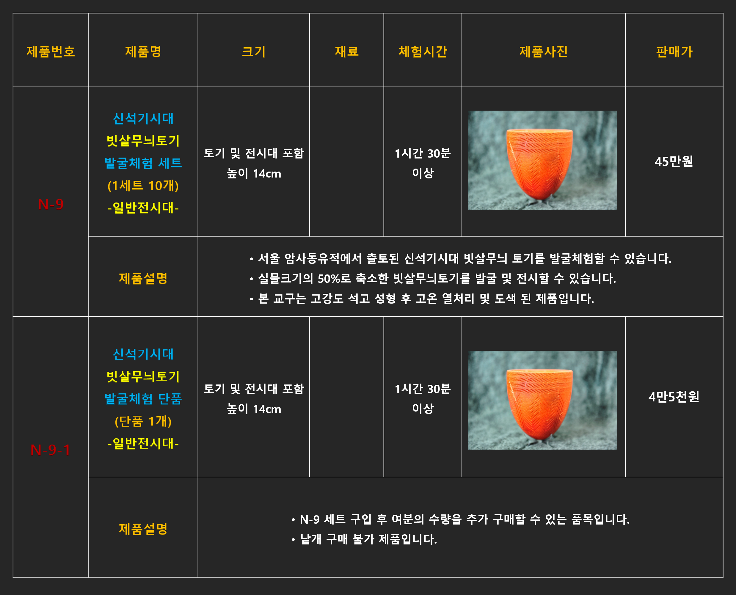 # N-9 신석기시대 빗살무늬토기 발굴체험 키트 1세트 10개(10인용) - 50만원(부가세포함) 견적서 및 주문서 바로가기 ↓ 플라스캠프에서 판매중인 모든 상품들은 선사시대 및 역사시대 고고학 전문