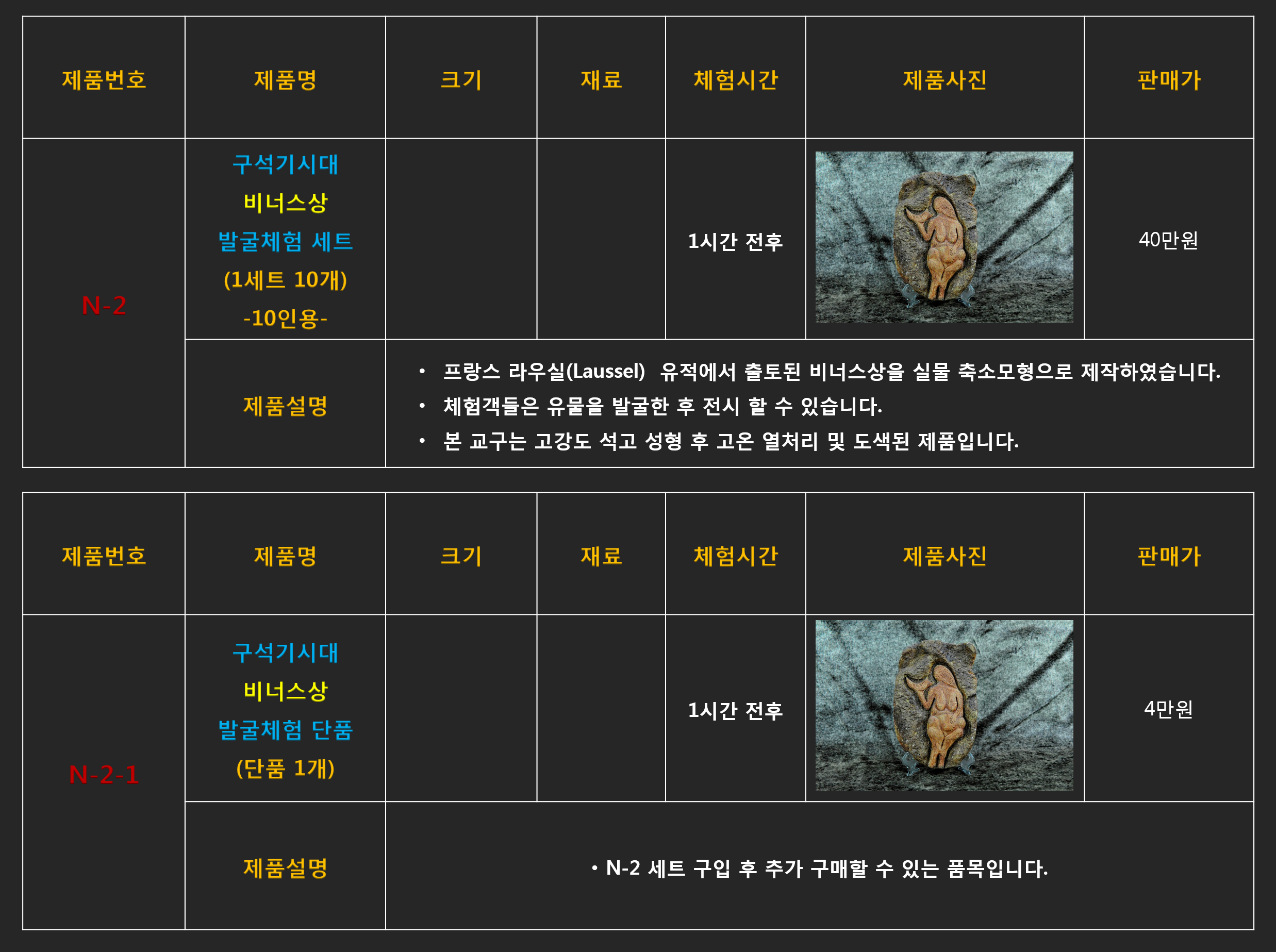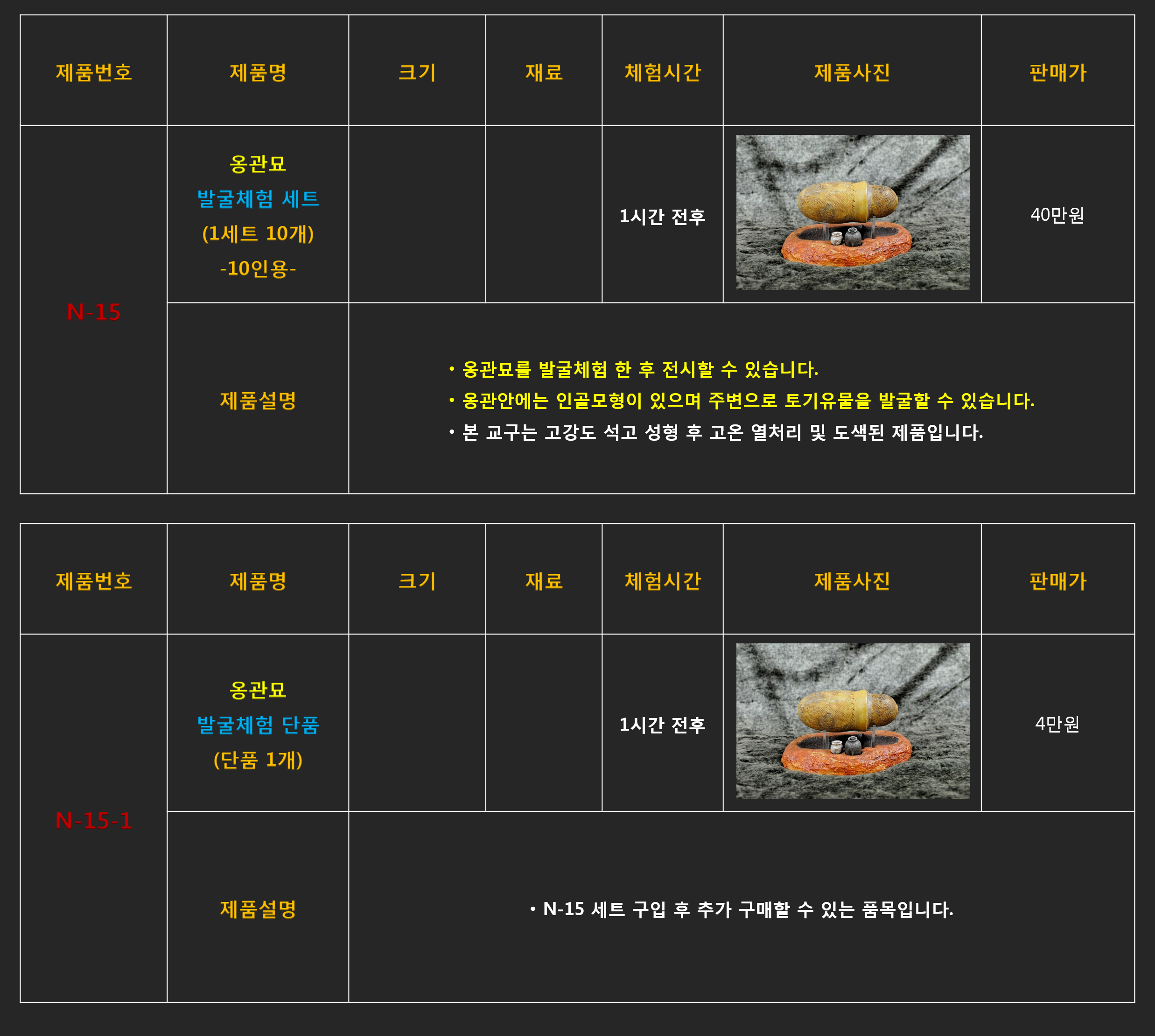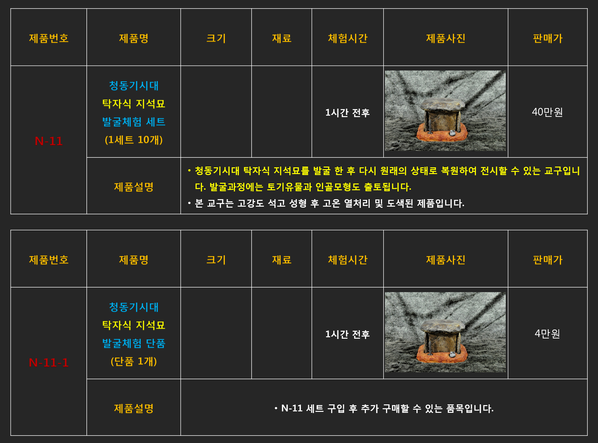 문화재 발굴체험 콘텐츠들은 판매를 위한 재고는 없으며 주문 완료후 최소 1달이상의 제작기간이 소요되기 때문에 구매담당자께서는 최소 1개월 이전 계약을 통해 주문완료해 주셔야 프로그램 일정에 맞게 납품될 수 있습니다.