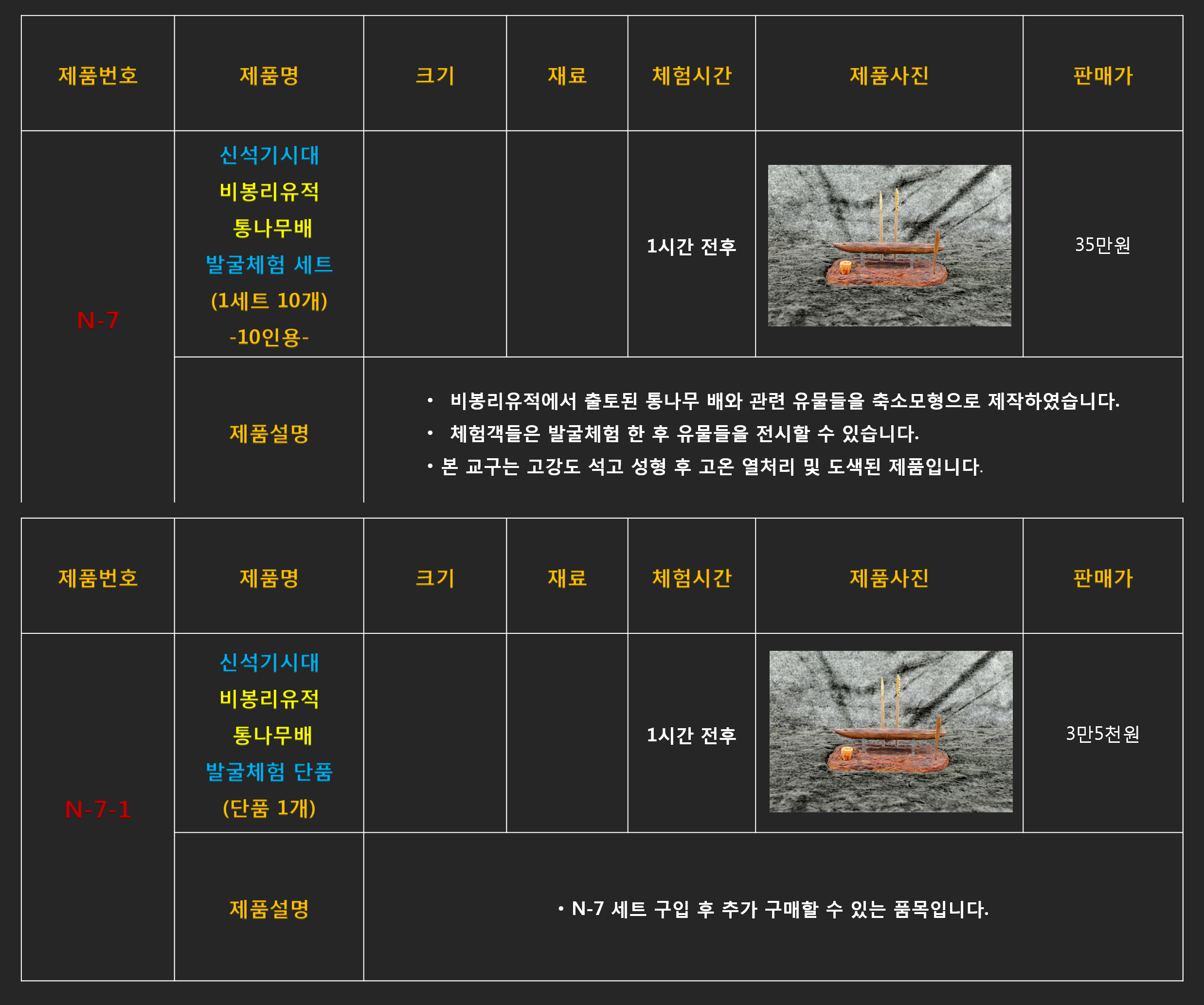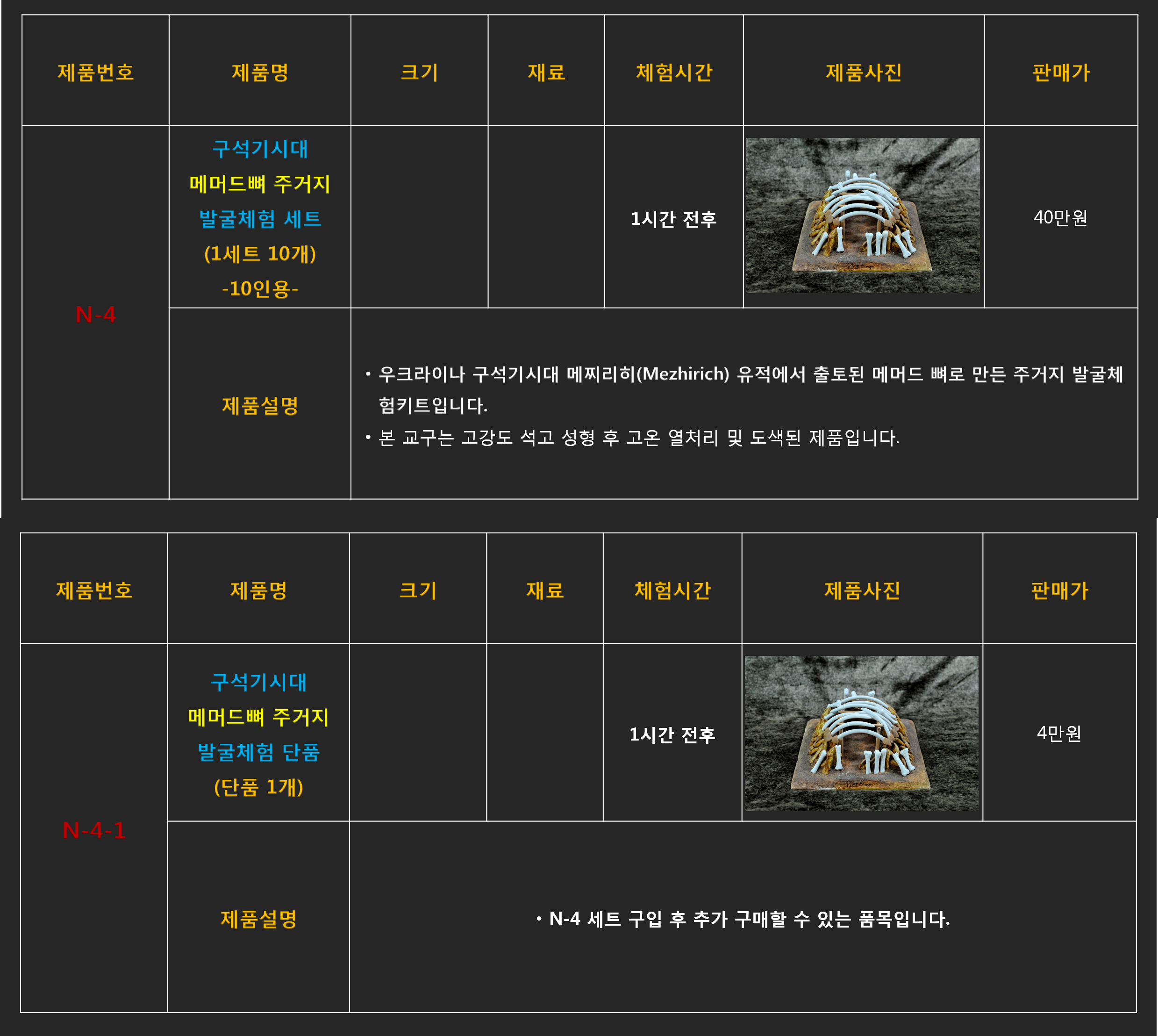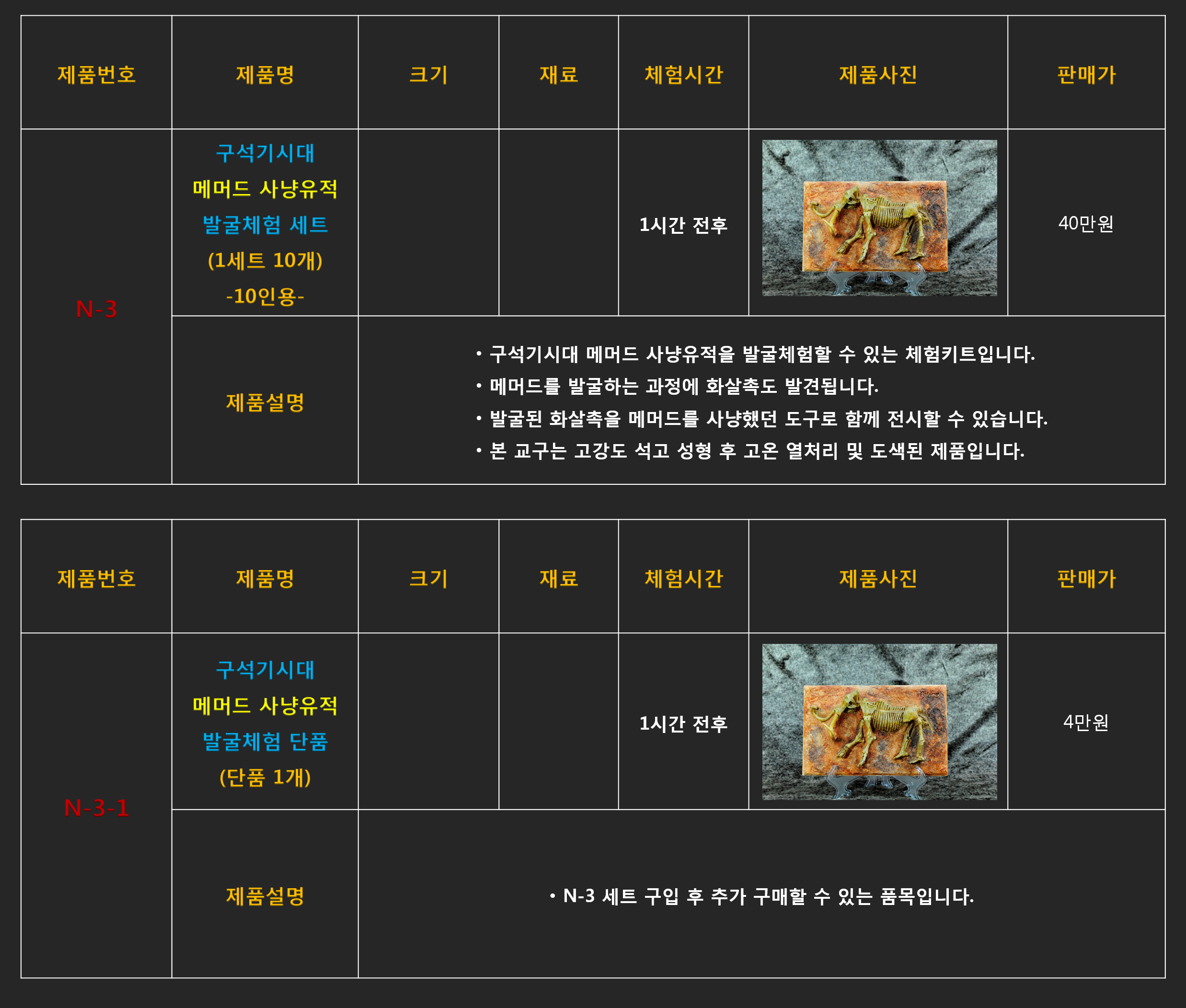 문화재 발굴체험 콘텐츠들은 판매를 위한 재고는 없으며 주문 완료후 최소 1달이상의 제작기간이 소요되기 때문에 구매담당자께서는 최소 1개월 이전 계약을 통해 주문완료해 주셔야 프로그램 일정에 맞게 납품될 수 있습니다.
