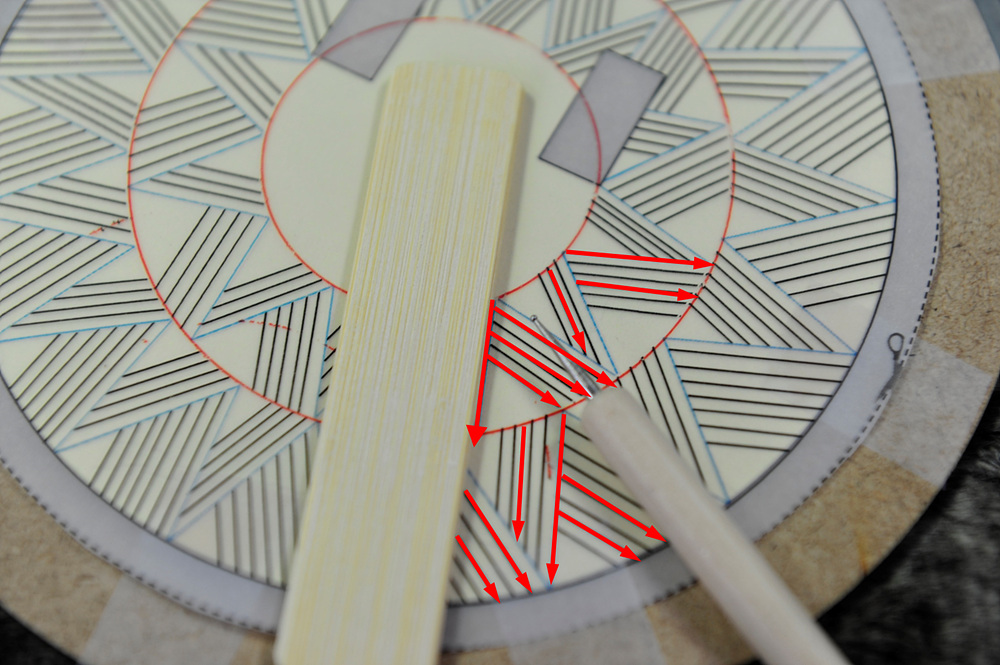 나무핀은 도안의 정중앙에 맞추어 나무콤파스를 끼운 후 수직으로 눌러 원형나무판에 고정시켜 줍니다.