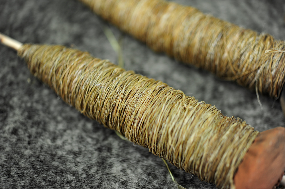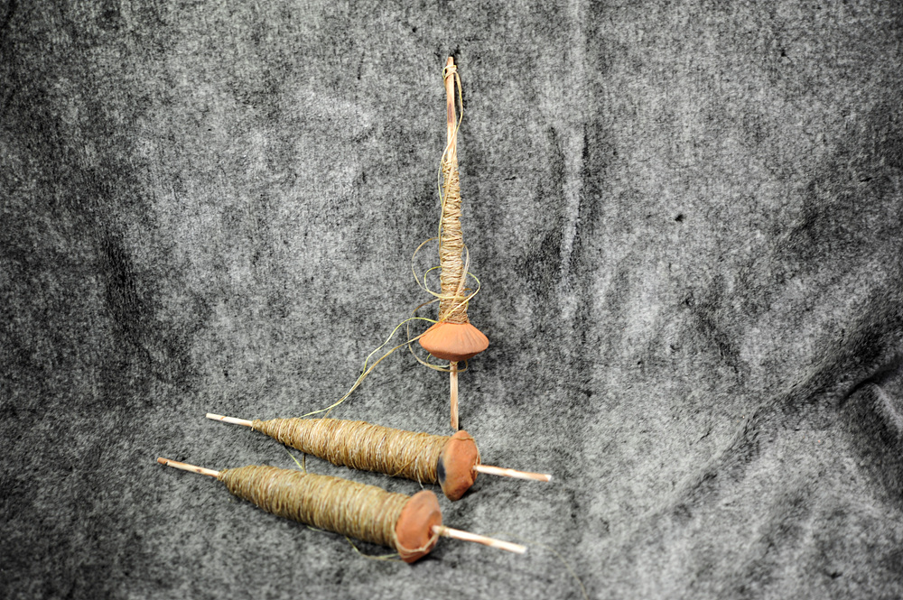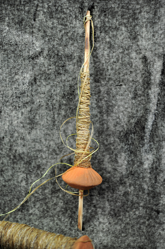 천연끈을 가락바퀴를 이용하여 실제로 꼬아서 제작한 후 전시연출