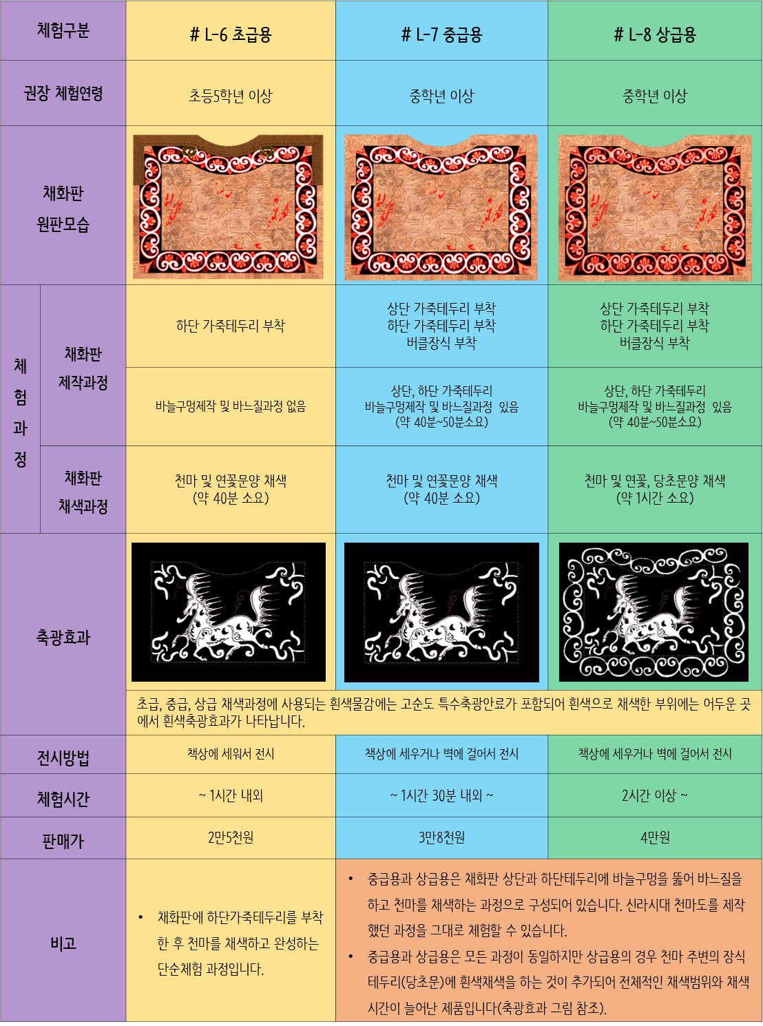 - 중급(L-7)과 상급(L-8)은 모든 과정이 동일하지만 <상급용>의 경우 천마도를 채색하는 범위가 넓고 제작 및 체험시간이 증가한 제품입니다. 체험시간이 다소 소요되지만 천마도의 완성도와 만족도가 가장 뛰어난 제품입니다.