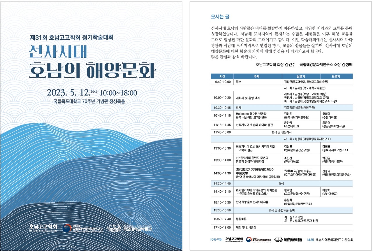 2023년 5월 12일(금) ‘선사시대 호남의 해양문화’이라는 주제로 목포대학교에서 제31회 정기학술대회를 개최합니다.