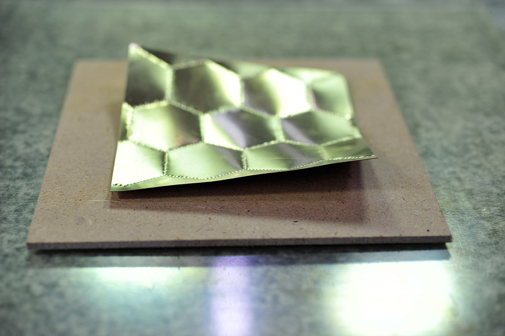 도안을 떼어낸 후 황동판에 부착된 고정 테이프도 제거해 줍니다. 테이프를 제거하면 사진에서 보이는 것처럼 황동판이 휘어지는 것을 볼 수 있습니다. 황동판을 뒤집어 망치로 골고루 때려서 어느정도 펴준 후 양손을 이용하여 앞뒤로 조심스럽게 구부려 가며 완전히 편평하게 펴줍니다. 절대로 황동판이 꺾이도록 구부리면 안됩니다.
