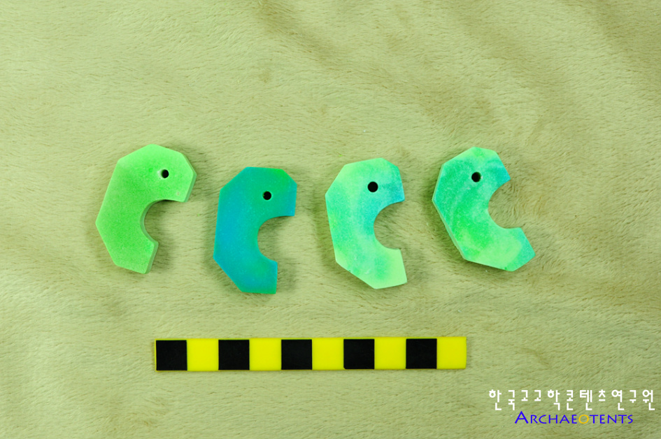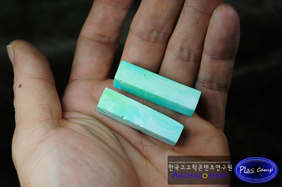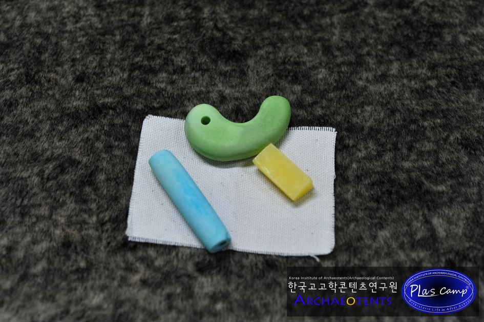 - 플라스캠프에서는 이러한 문제점들을 알고 오랜기간 이것을 대체할 수 있는 교구를 개발하기 위해 고민해왔으며 옥을 대체할 수 있는 소재와 발색을 내기 위한 많은 연구 끝에 곡옥제작체험이 가능한 교구를 준비하였습니다.